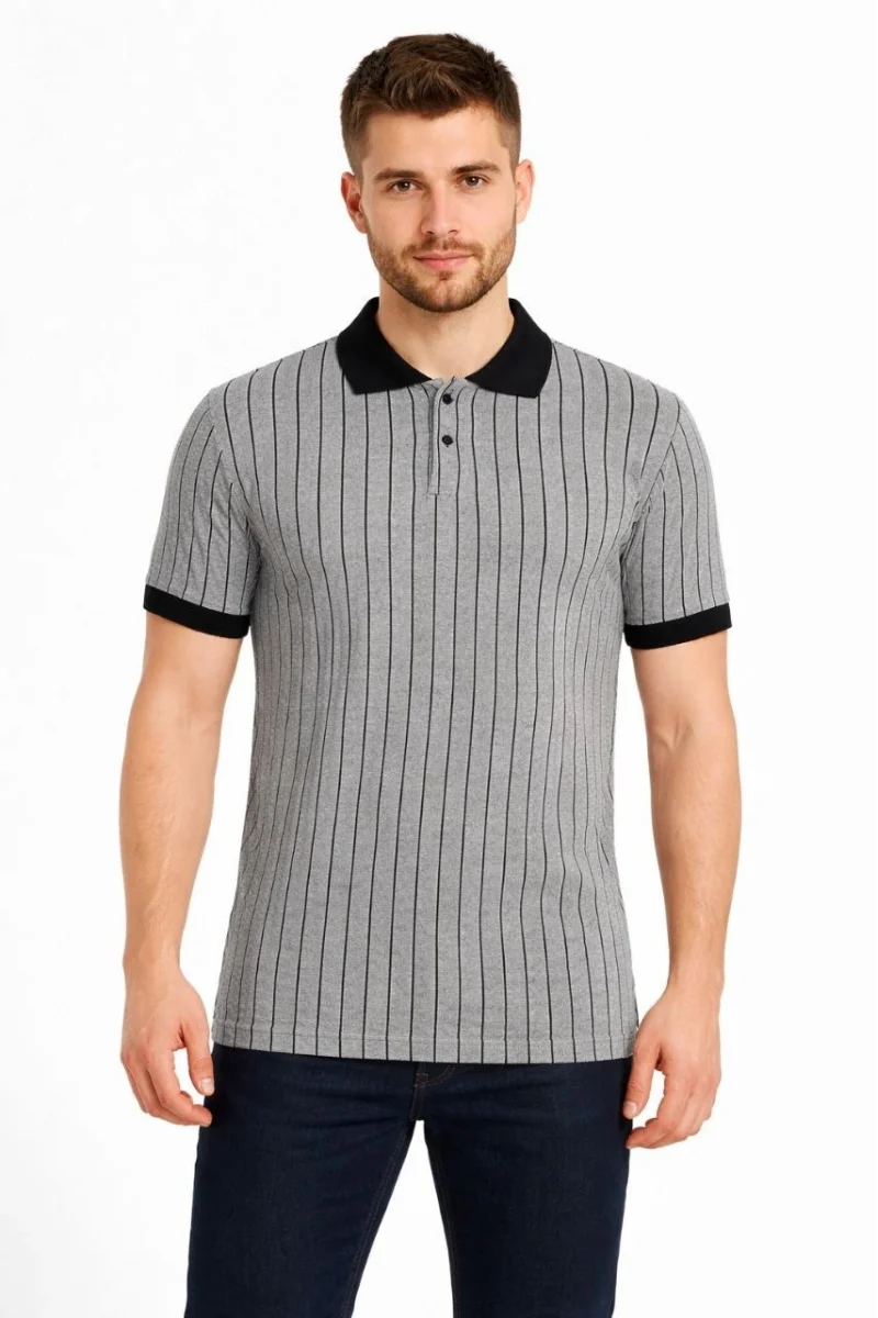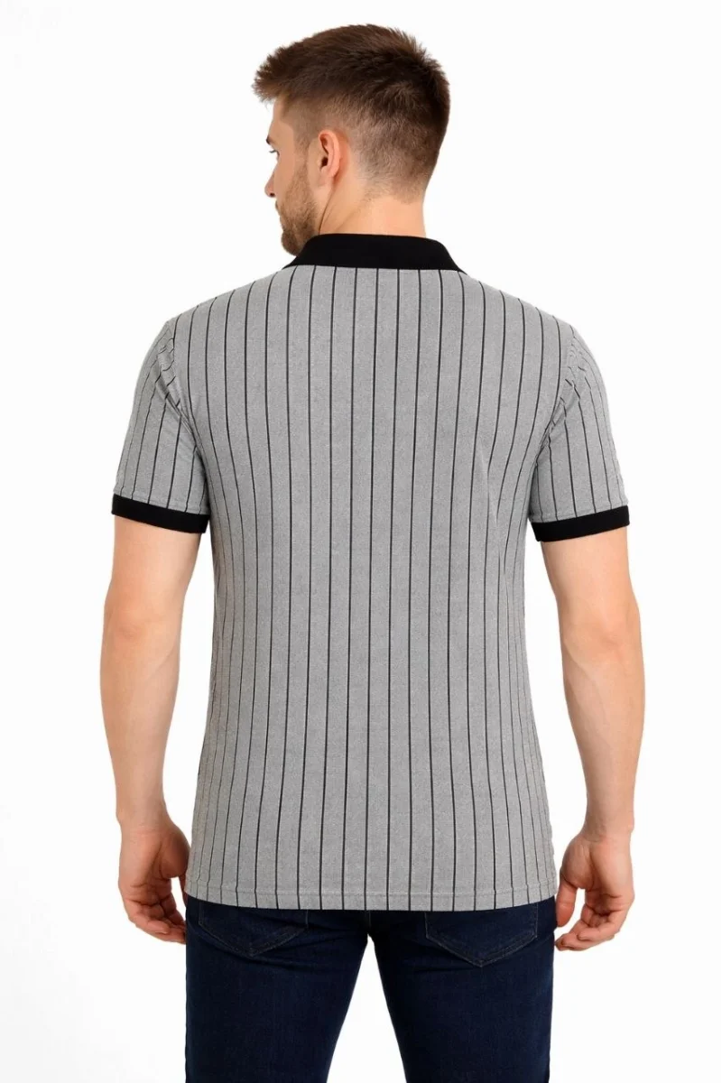 Erkek Polo Yaka Çizgili Tişört Kısa Kol Düğmeli Yazlık T-Shirt - Gri