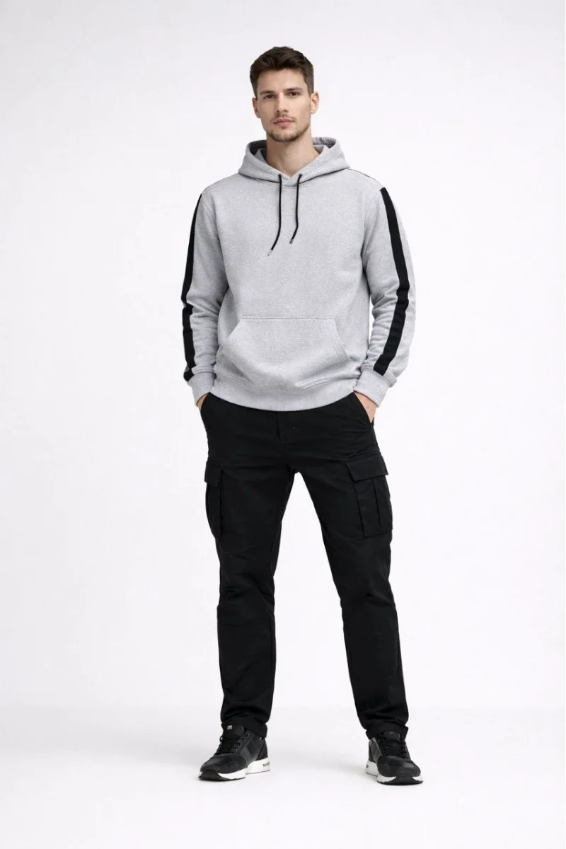 Erkek Şeritli Kapüşonlu Sweatshirt Oversize 3 iplik Pamuklu - Beyaz