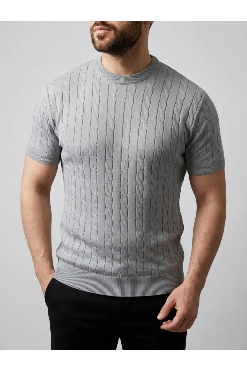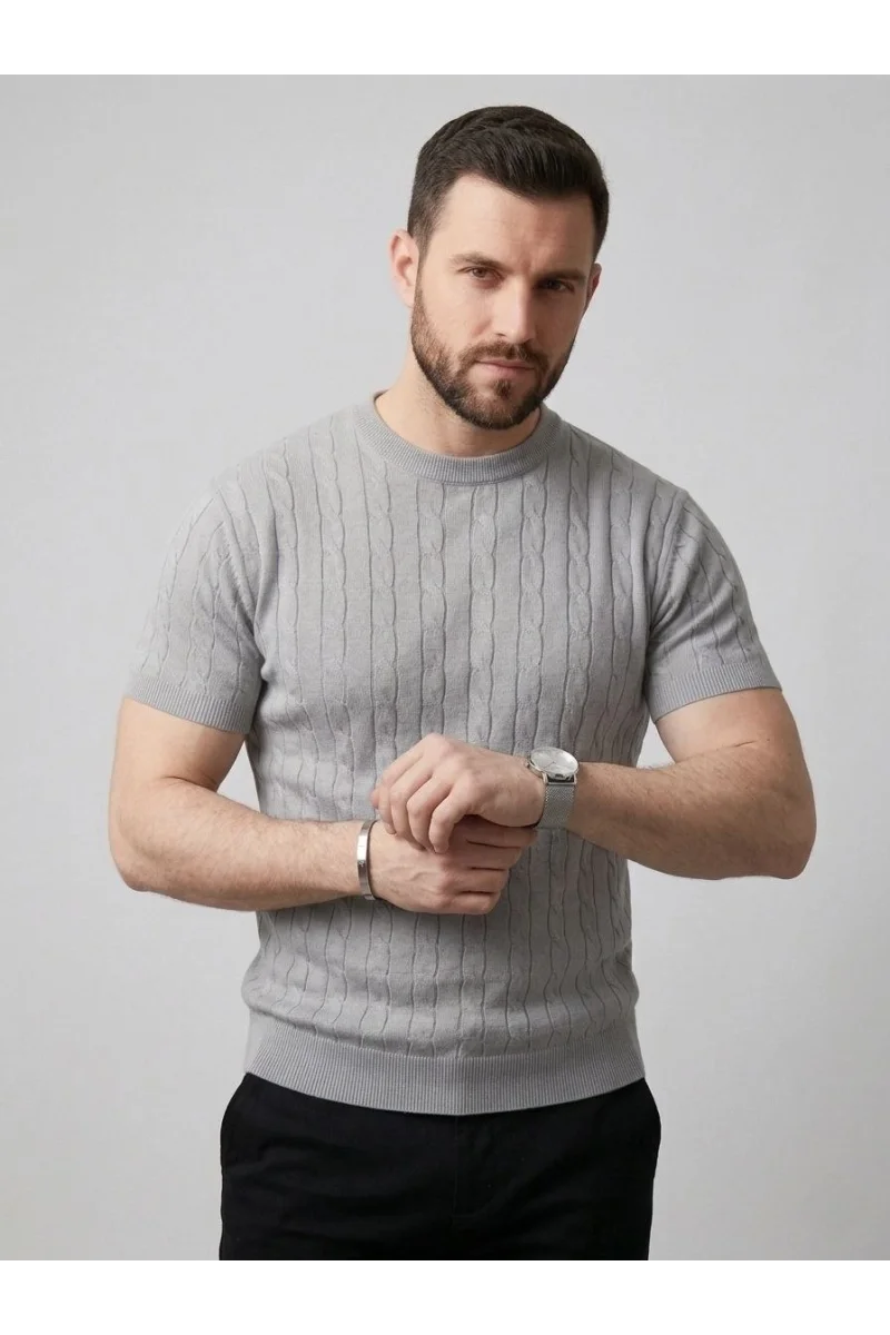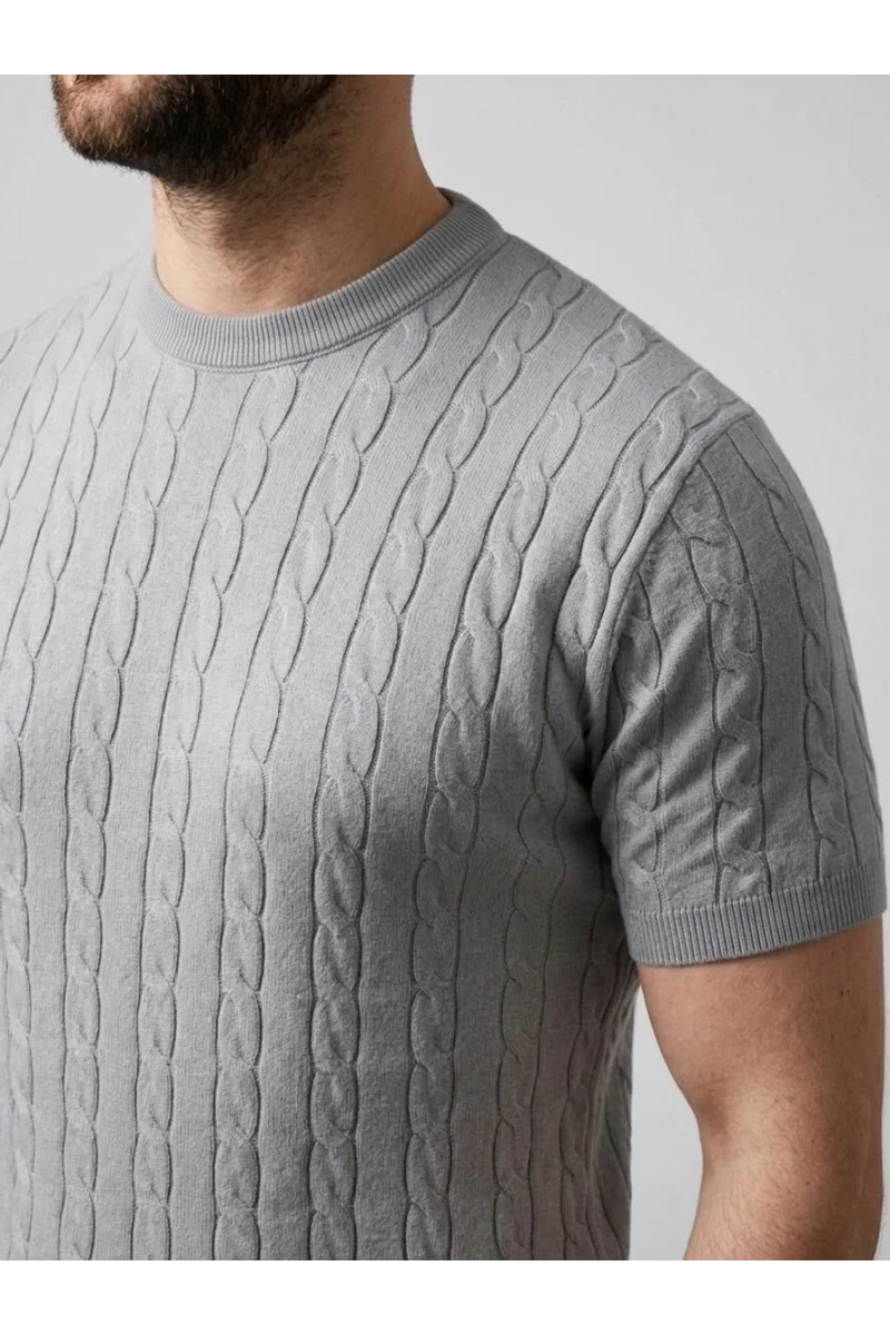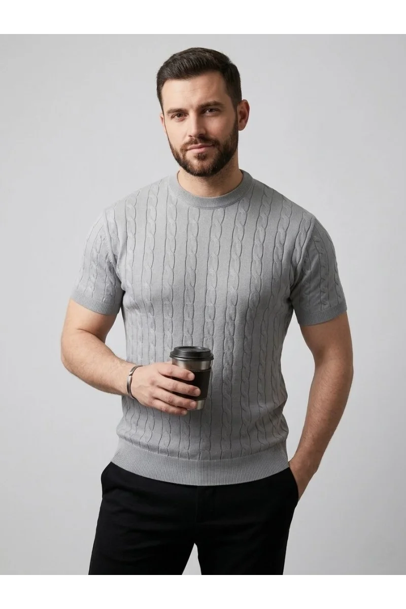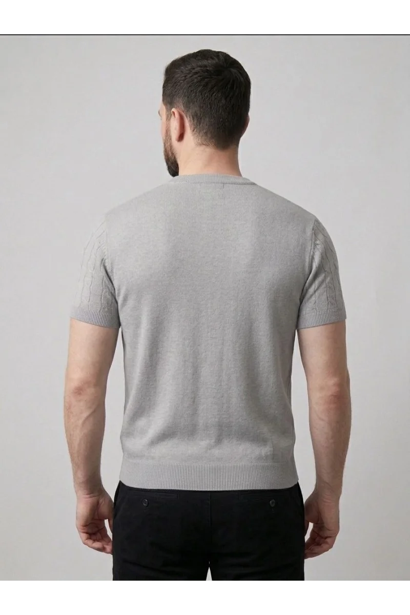 Erkek Yazlık Triko Dokuma Tişört Kısa Kol Bisiklet Yaka Örgü Desenli T-Shirt - Gri