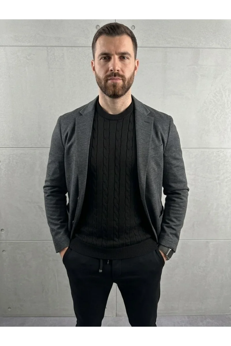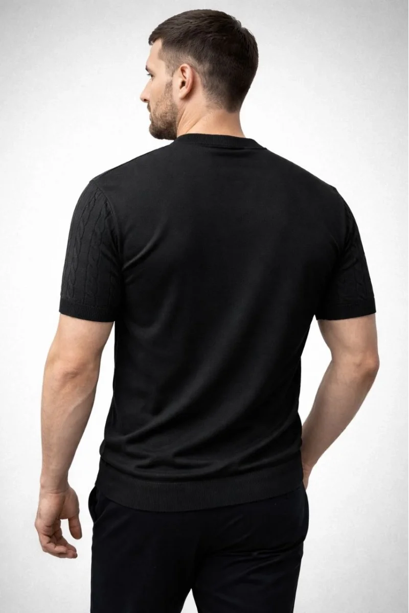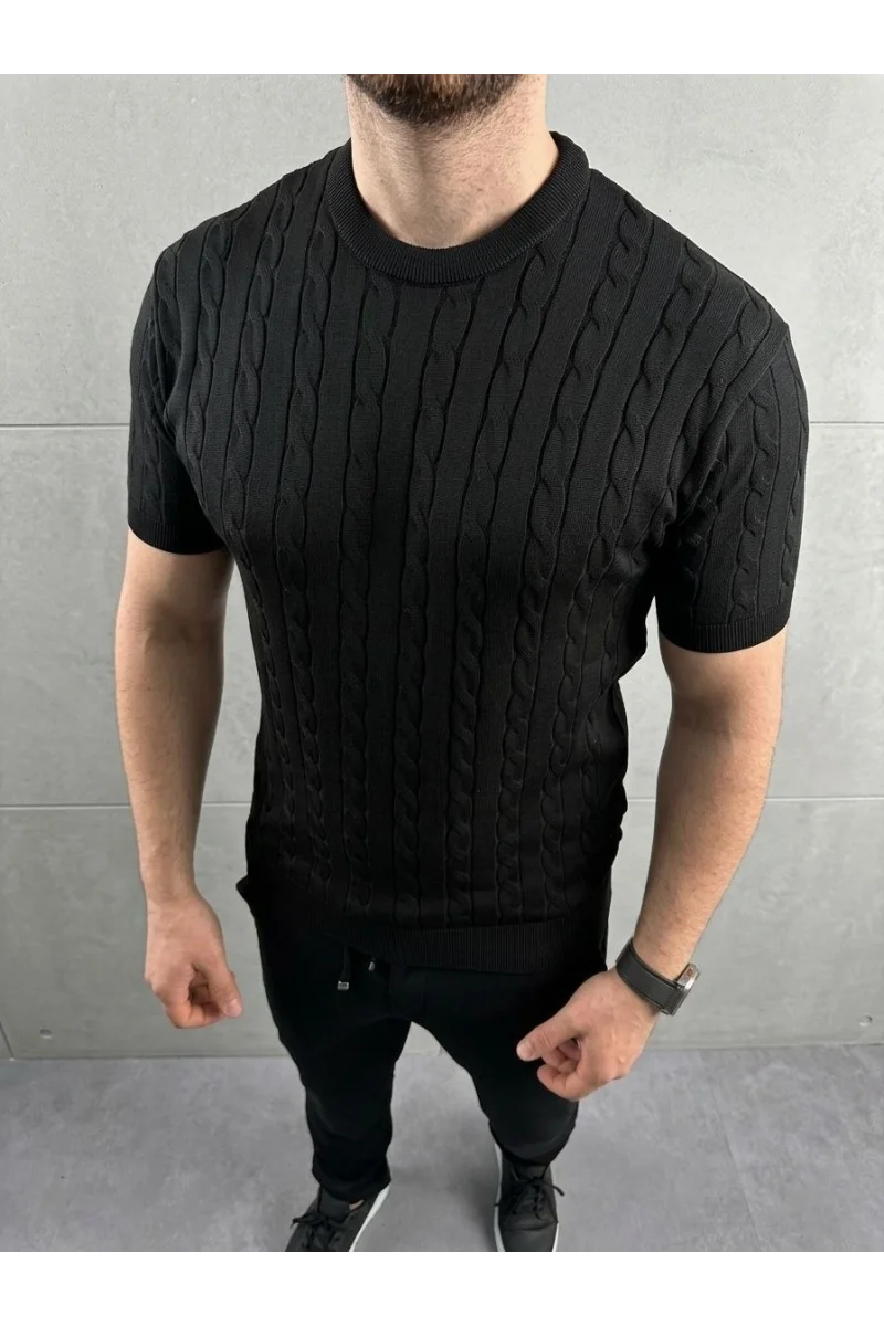 Erkek Yazlık Triko Dokuma Tişört Kısa Kol Bisiklet Yaka Örgü Desenli T-Shirt - Siyah