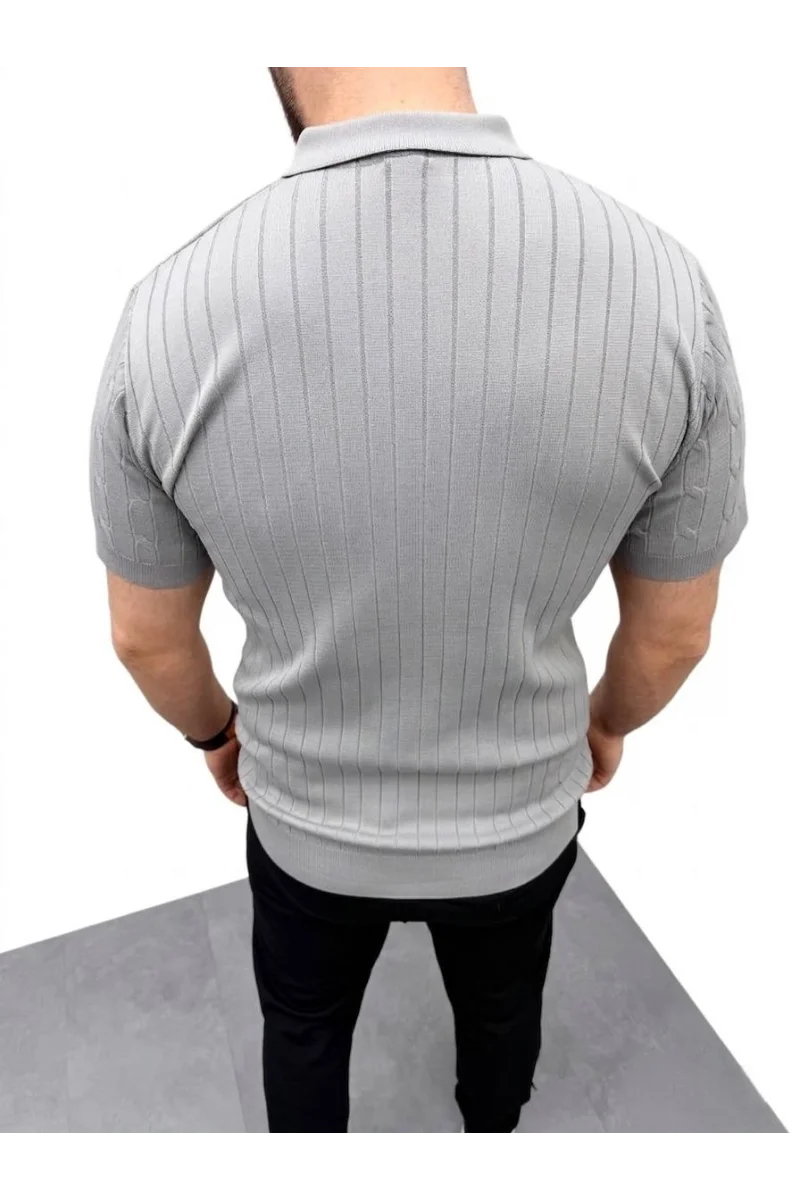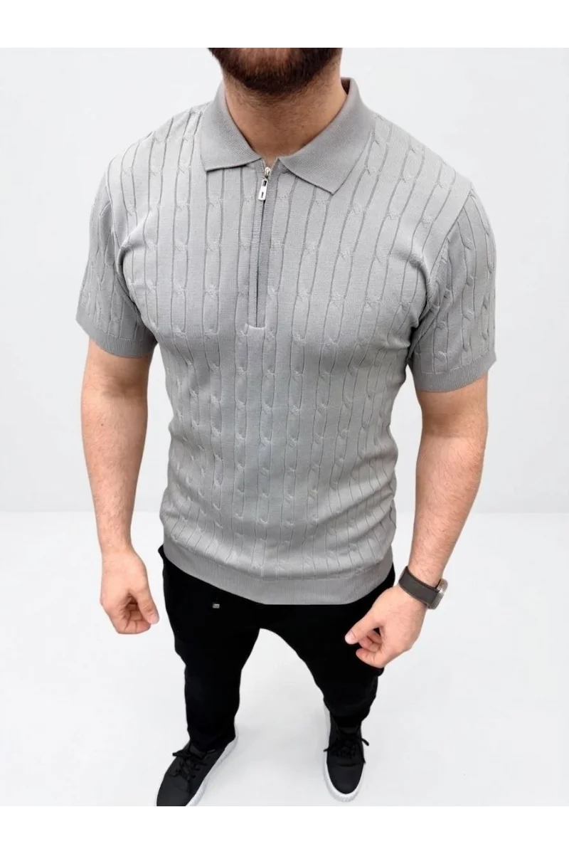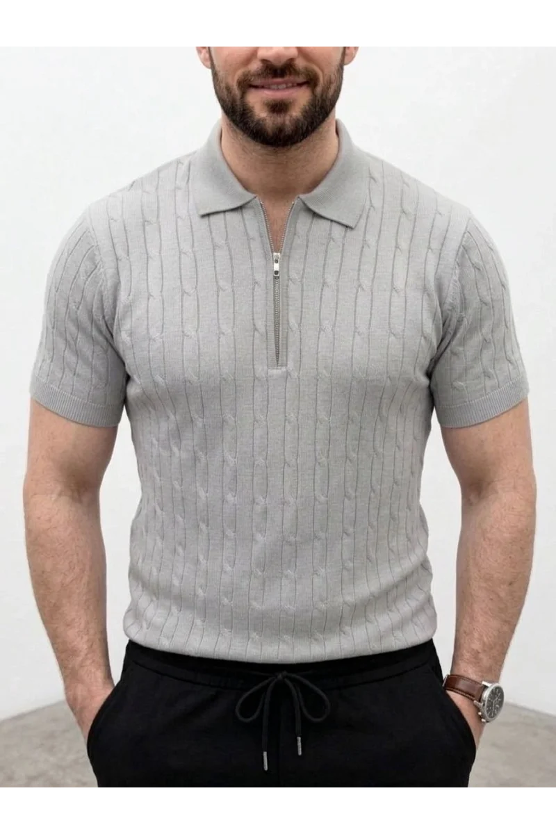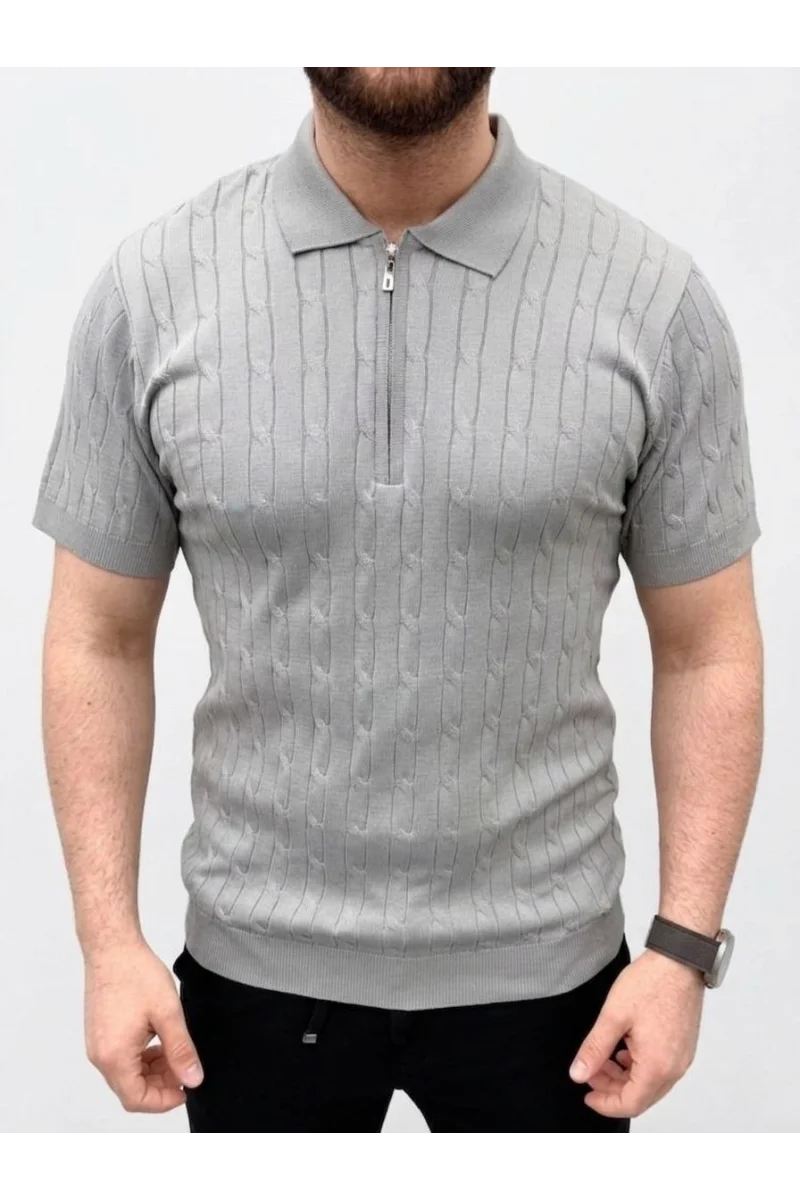 Erkek Yazlık Triko Saç Örgü Tişört Kısa Kol Polo Yaka Fermuarlı T-Shirt - Gri