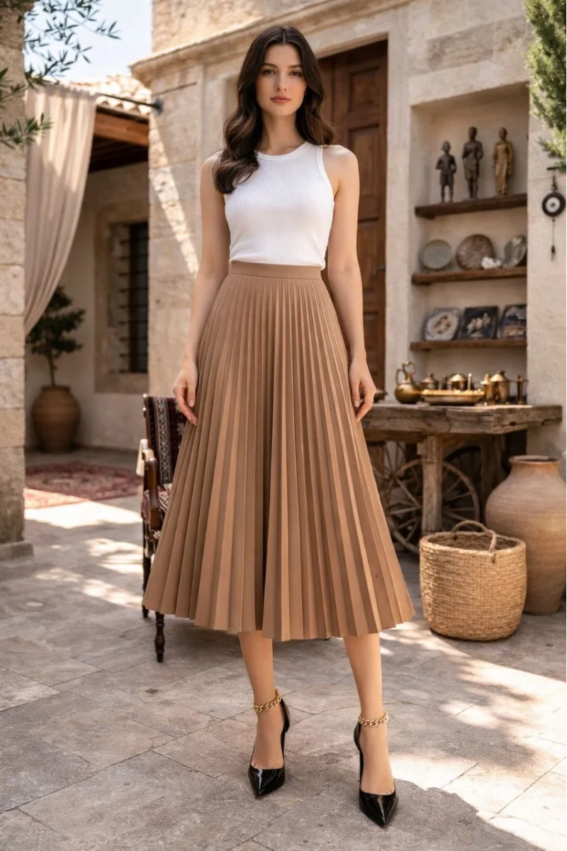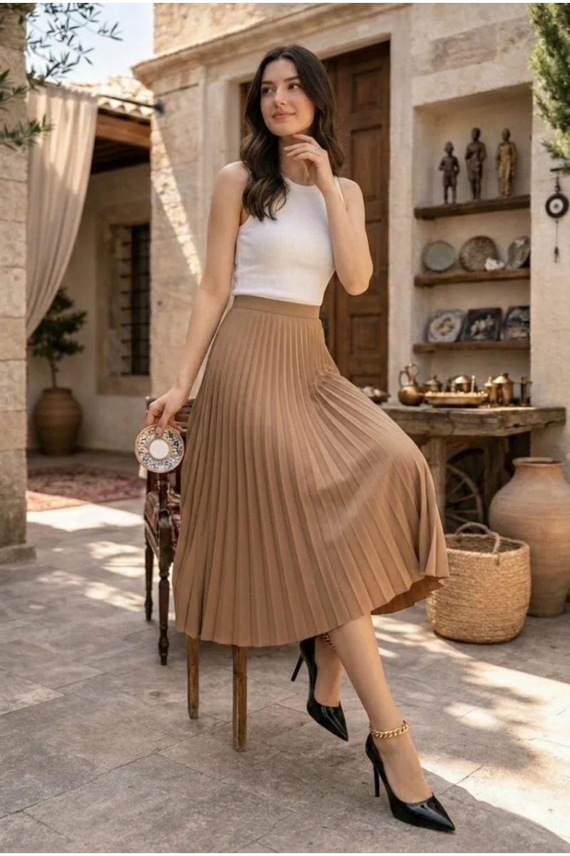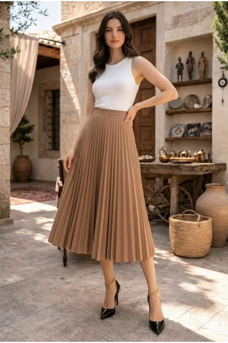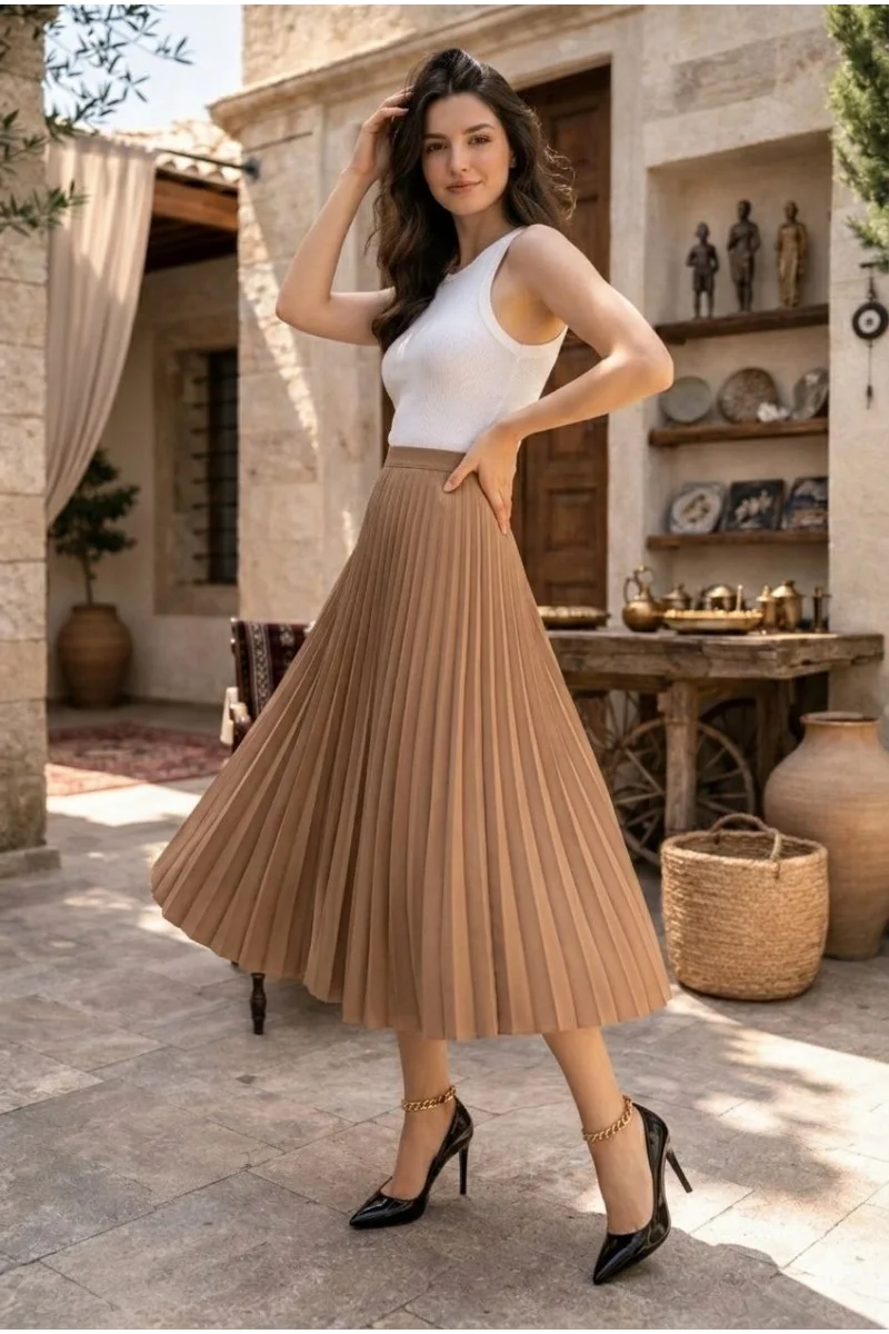 Kadın 90 Cm Saten Kumaş Pliseli Midi Etek Şık ve Zarif Tasarım - Kahverengi