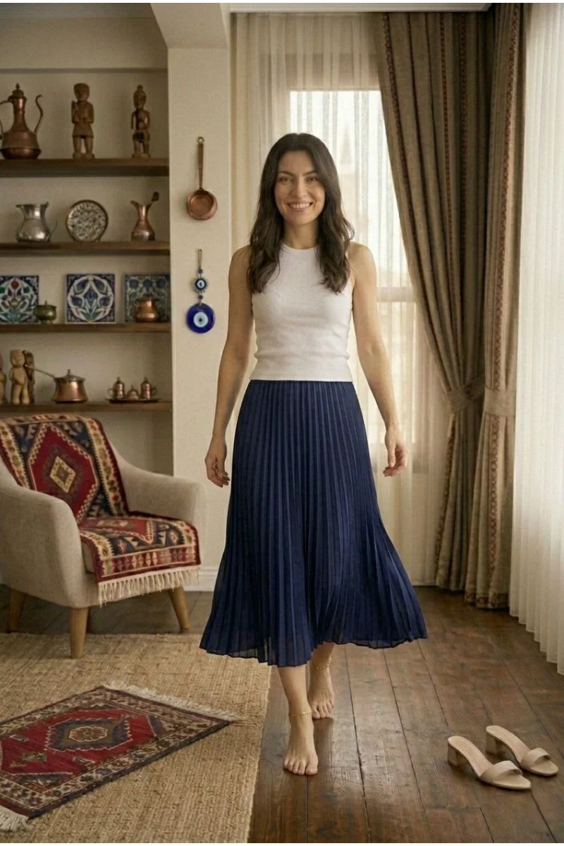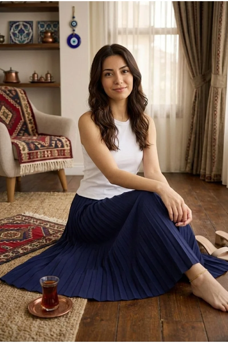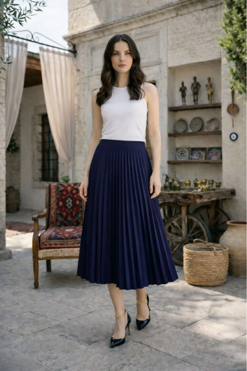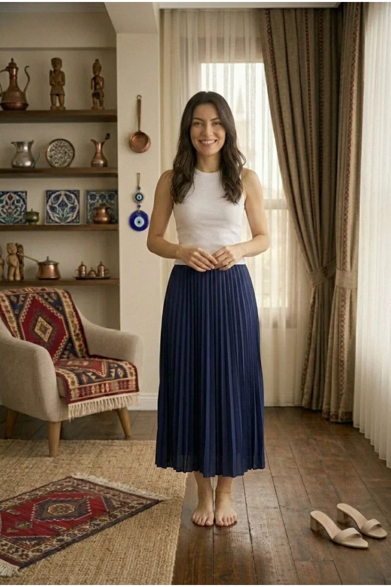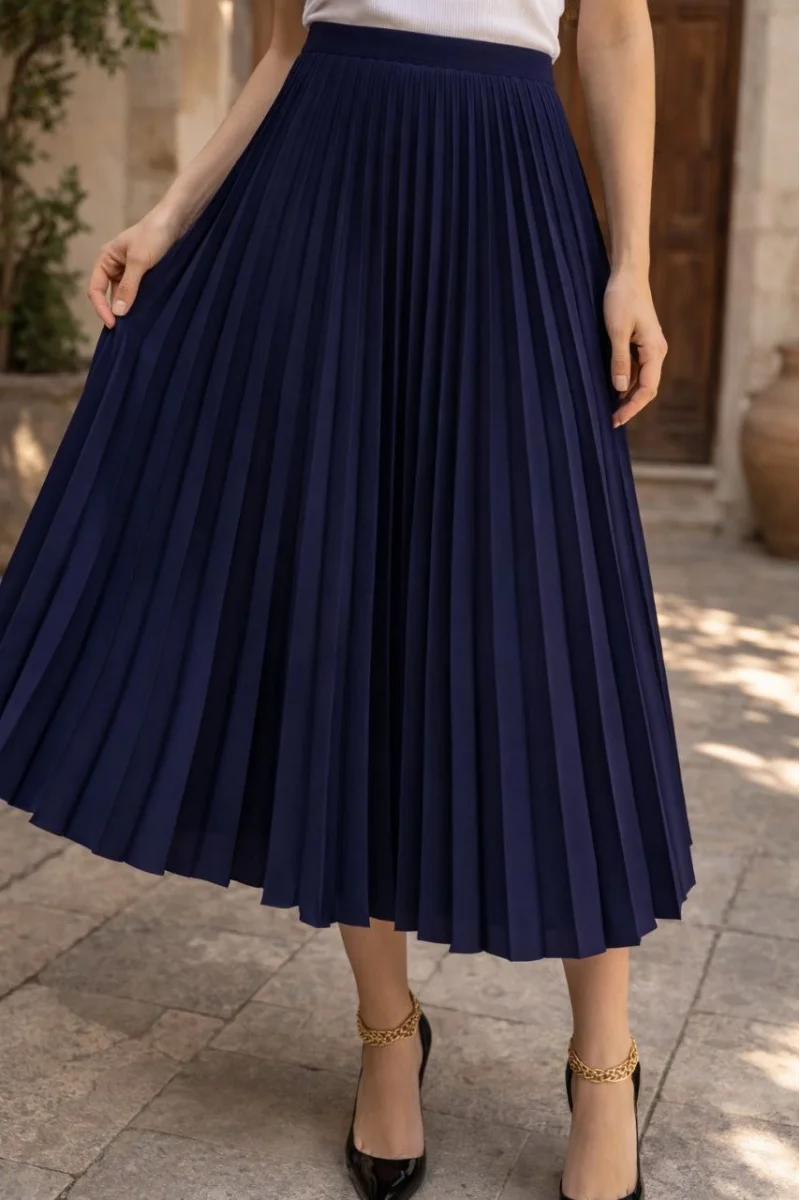 Kadın 90 Cm Saten Kumaş Pliseli Midi Etek Şık ve Zarif Tasarım - Lacivert