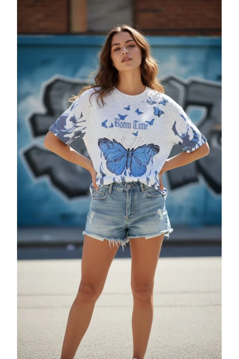 Kadın Asit Yıkamalı Oversize Tişört Mavi Kelebek Baskılı Dijital Print Bisiklet - Beyaz