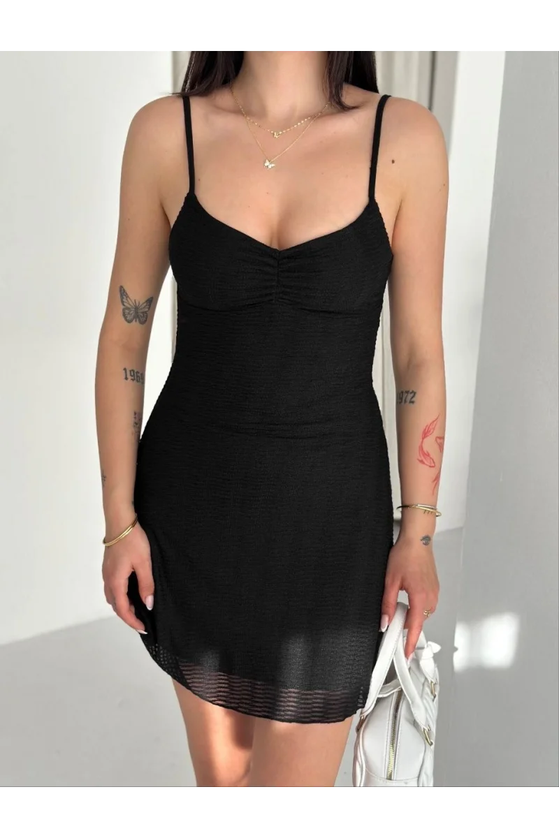Kadın Askılı Mini Elbise Drapeli Göğüs Detay Likralı Yazlık Fit - Siyah