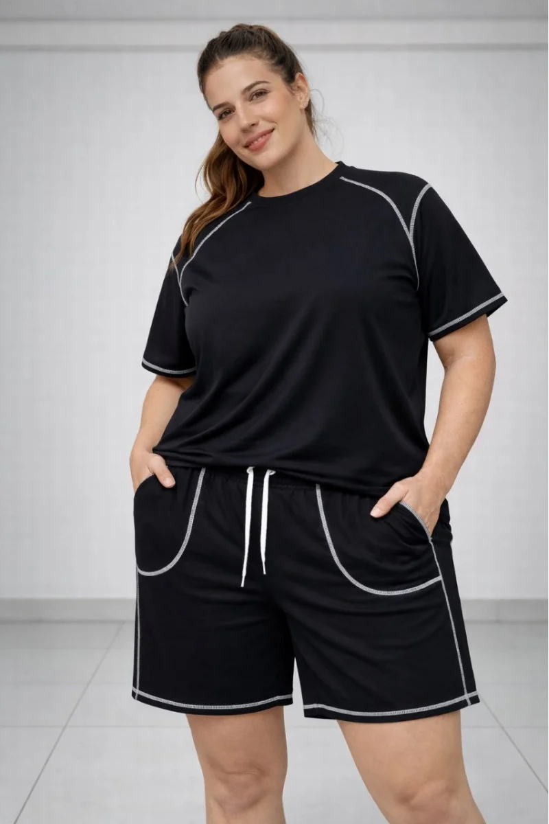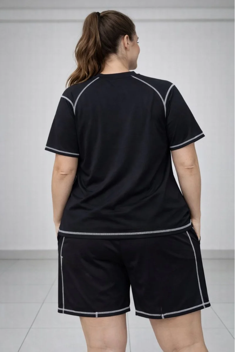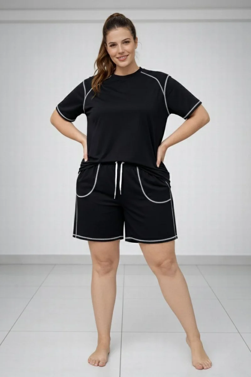 Kadın Battal Beden Kısa Kollu Tişört Şort Takım Kontrast Dikiş Detaylı Günlük Ev Giyimi - Siyah