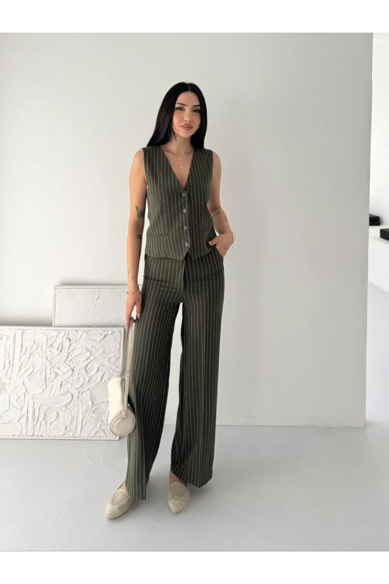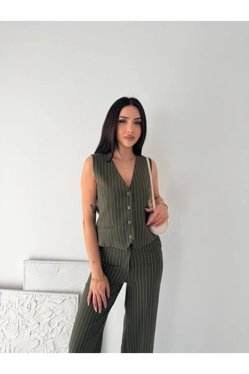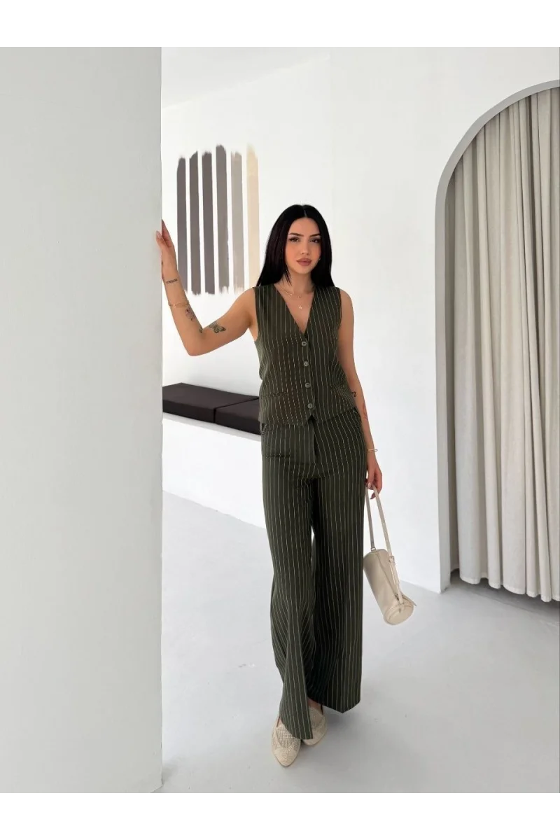 Kadın Çizgili Tansel Kumaş Yelek Pantolon İkili Takım Ofis Şık Modern - Haki