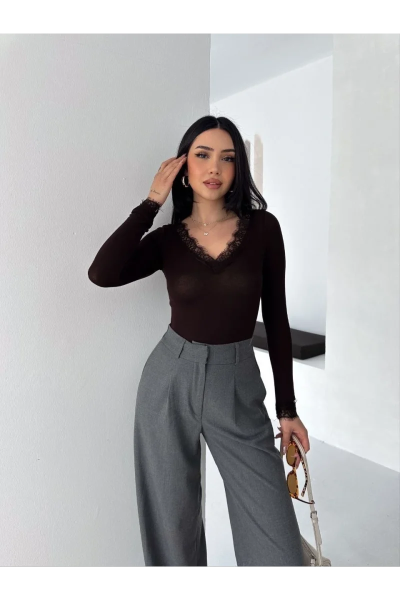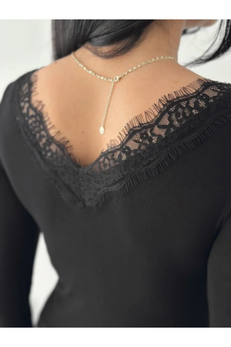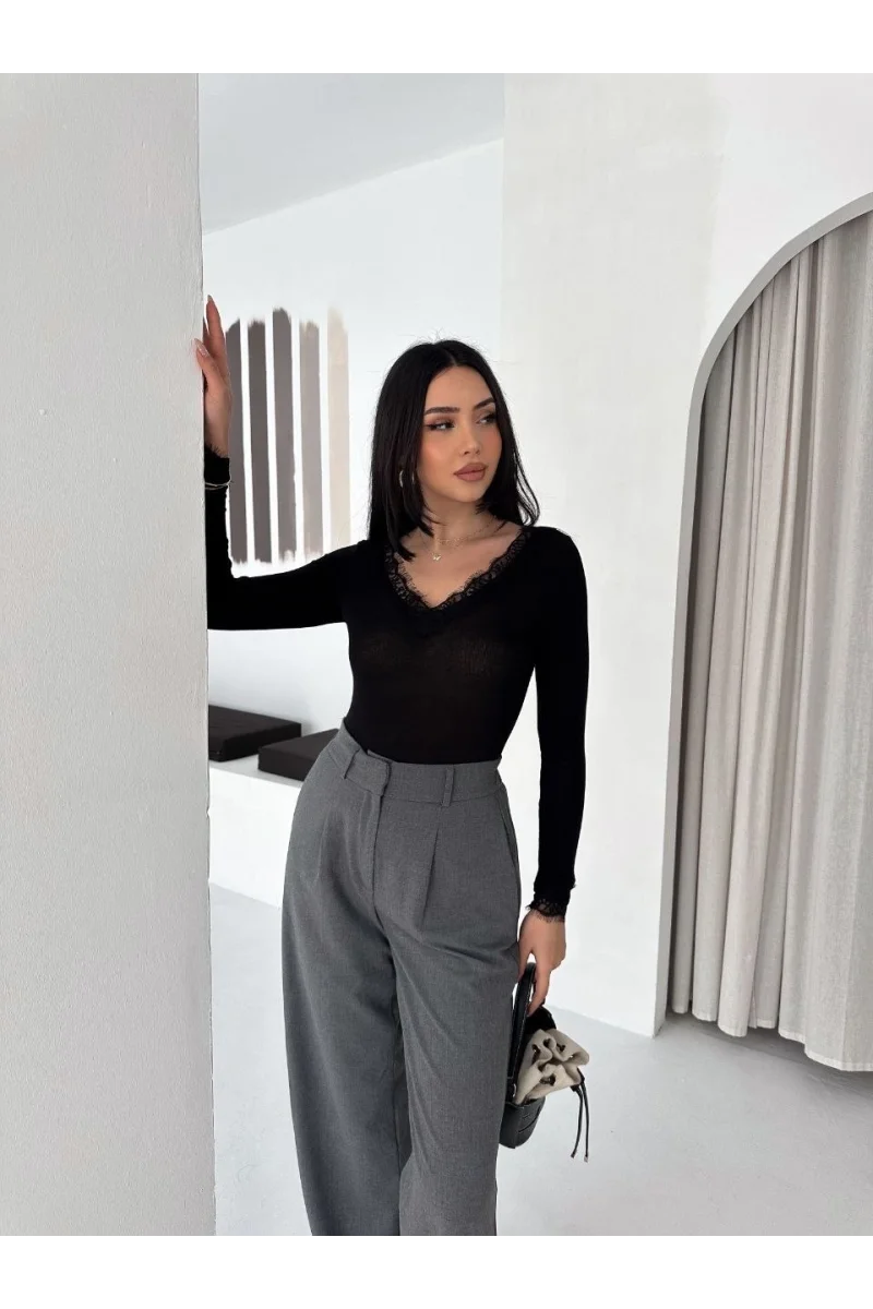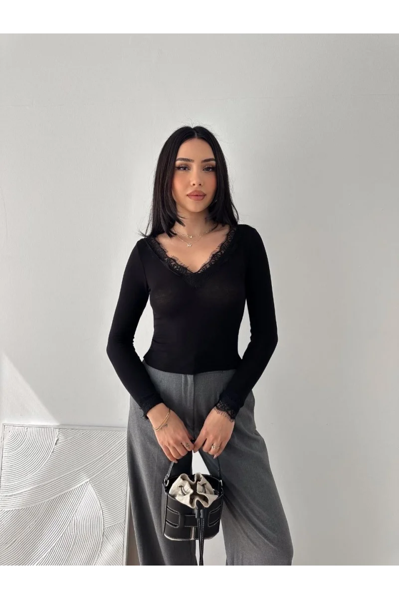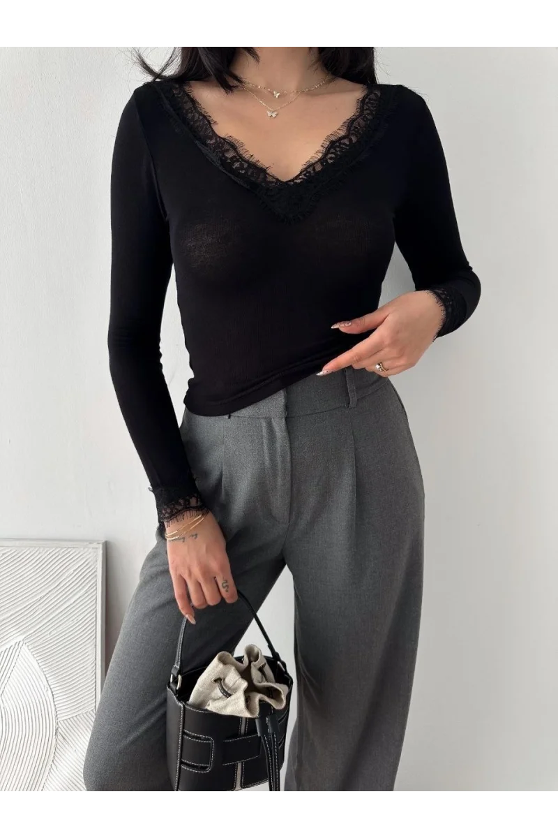 Kadın Dantel Detaylı V Yaka Arkası V Yaka Kaşmir Dokulu Uzun Kollu Bluz - Siyah