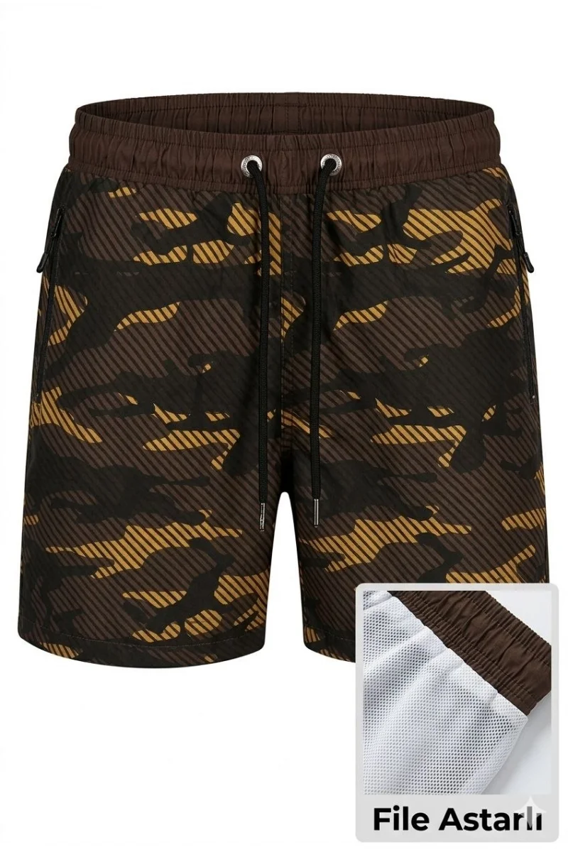 Kadın Deniz Şortu Fermuarlı Cepli File Astarlı Hızlı Kuruyan Premium - Kahverengi