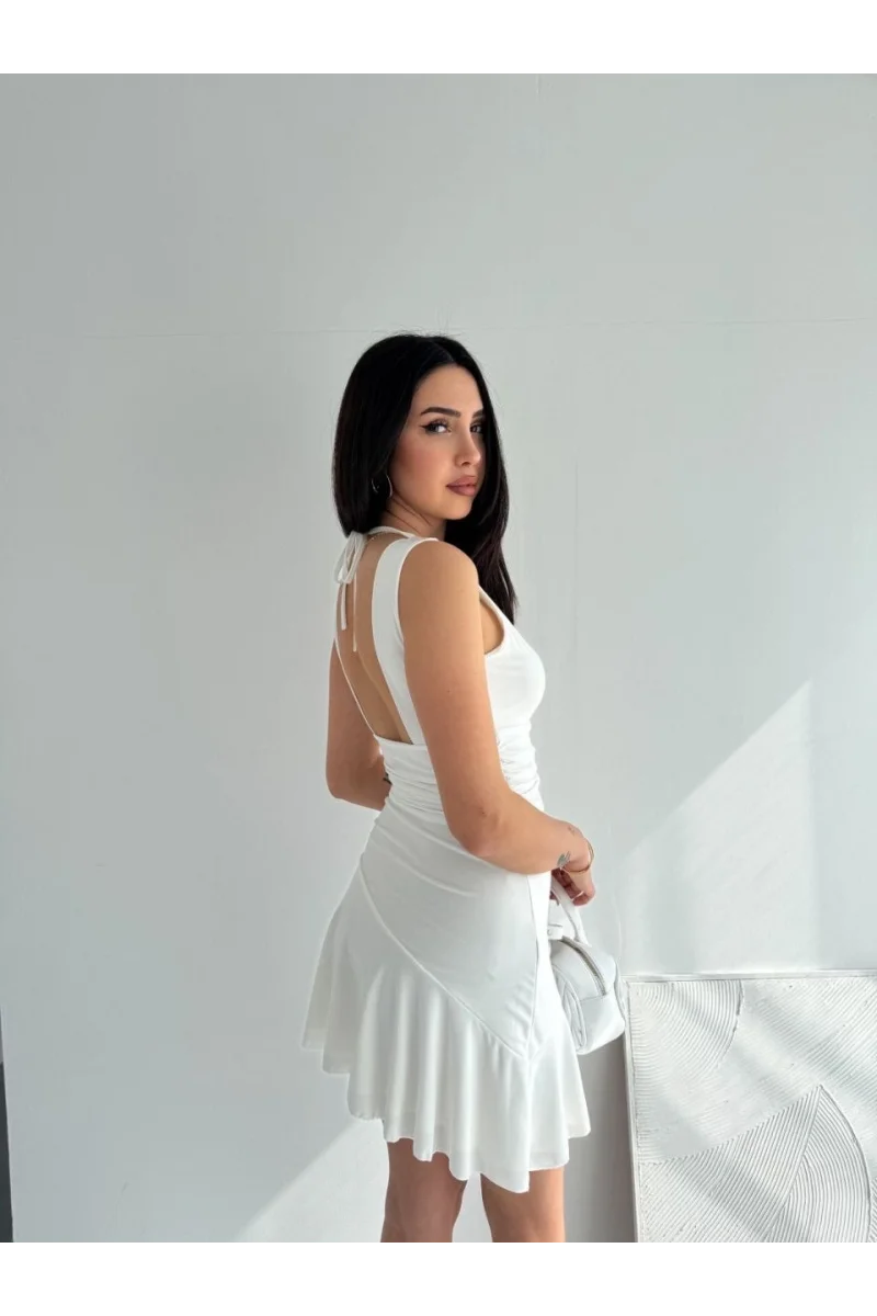 Kadın Derin V Yaka Sırt Dekolteli Mini Elbise Drapeli Şık Kolsuz - Beyaz