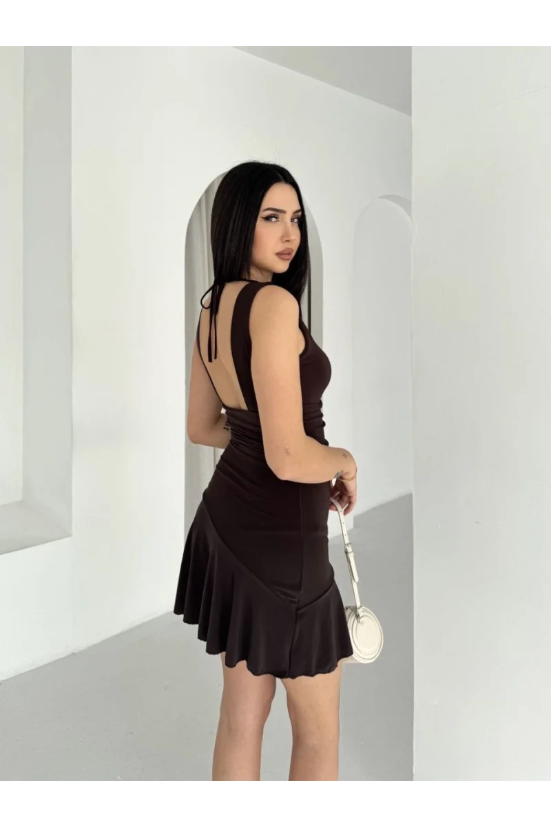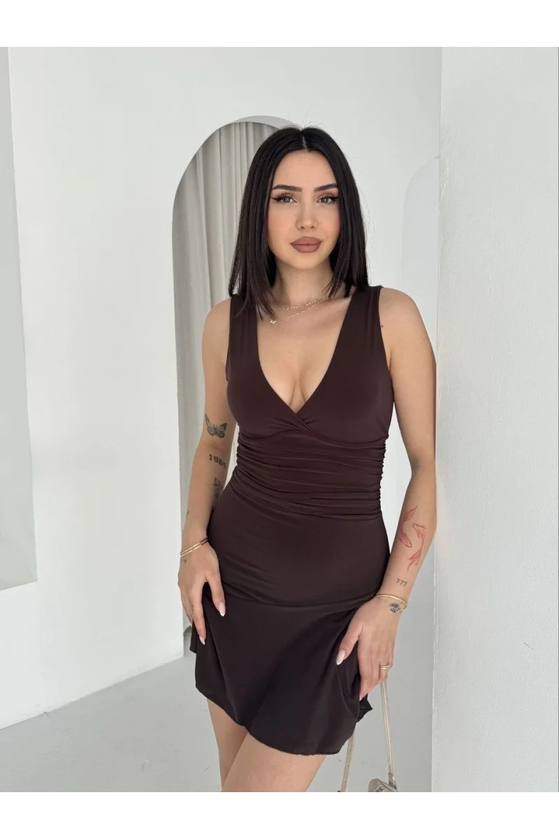 Kadın Derin V Yaka Sırt Dekolteli Mini Elbise Drapeli Şık Kolsuz - Kahverengi