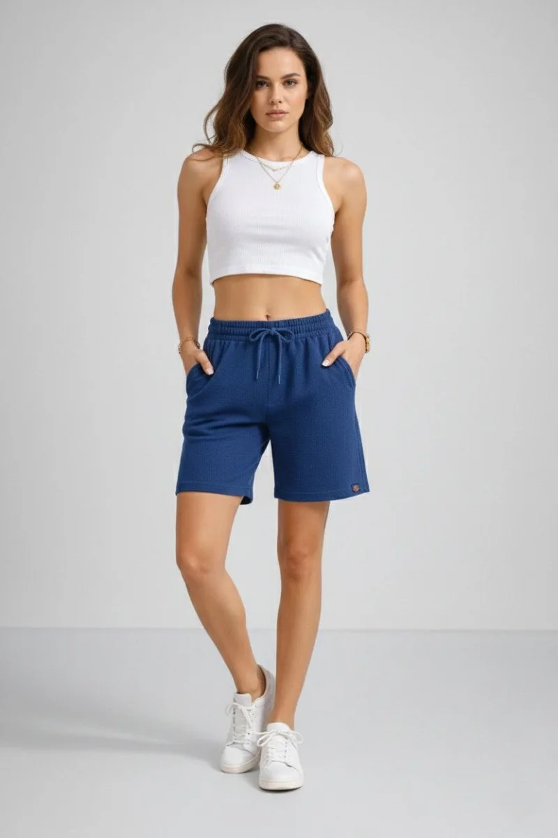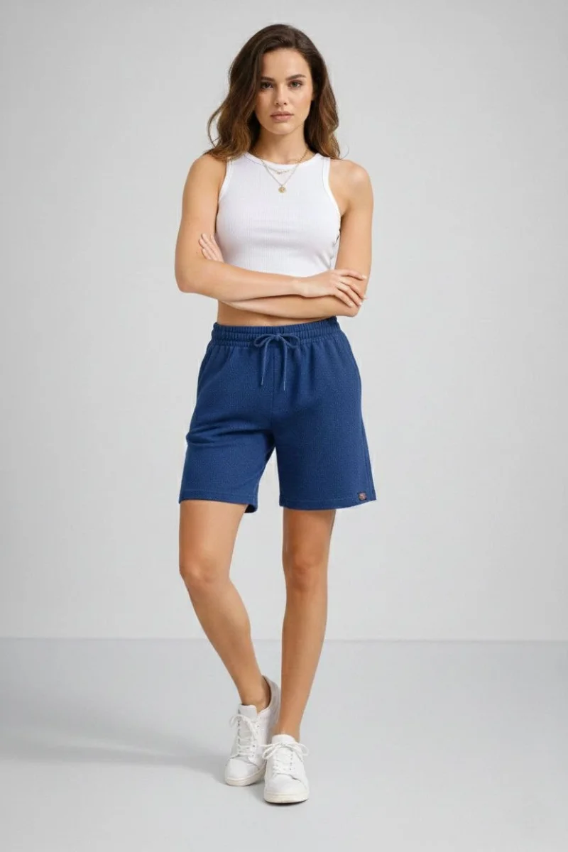 Kadın Dokuma otoban Şort Beli Lastikli Bağcıklı Cepli Kesim Şort - İndigo