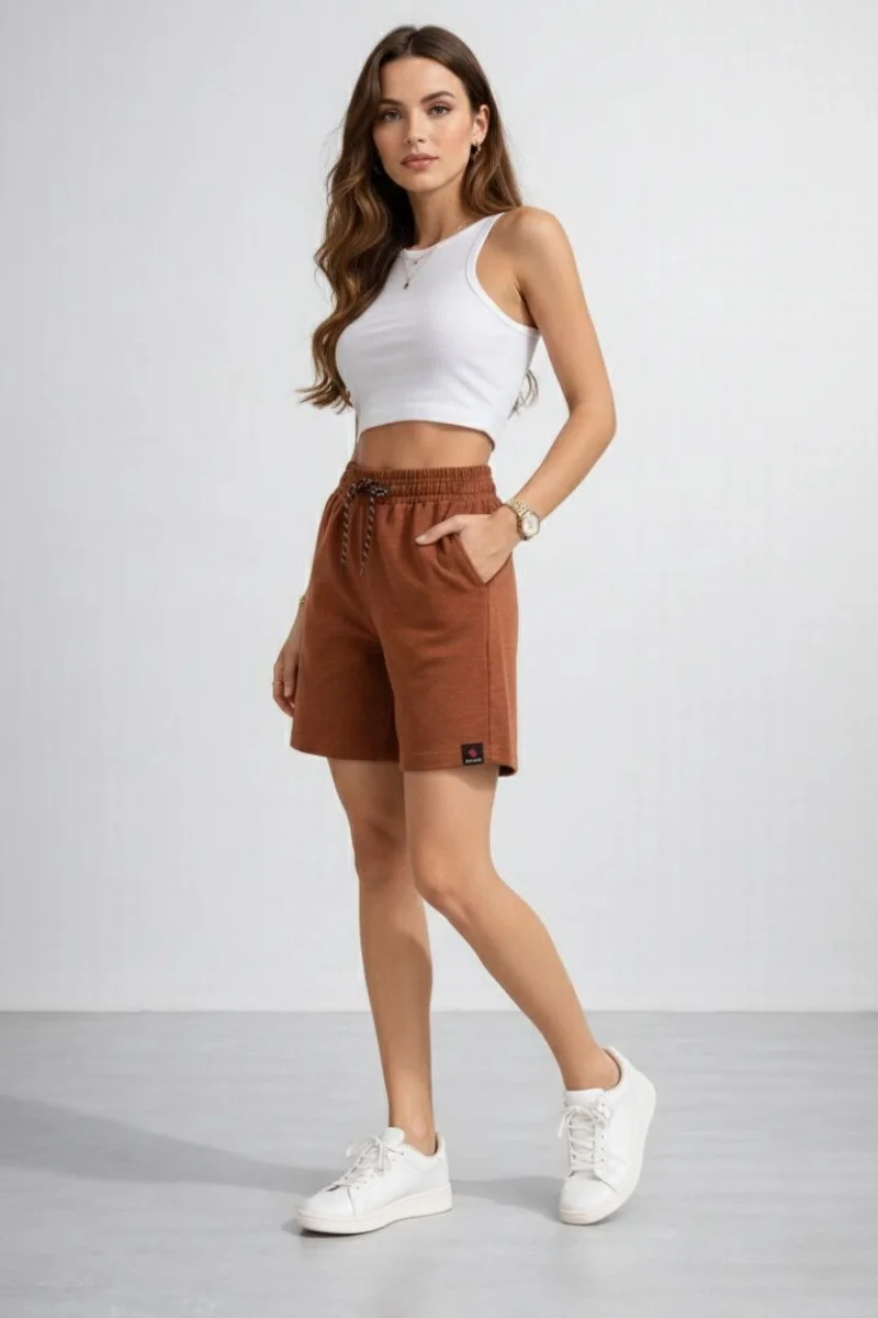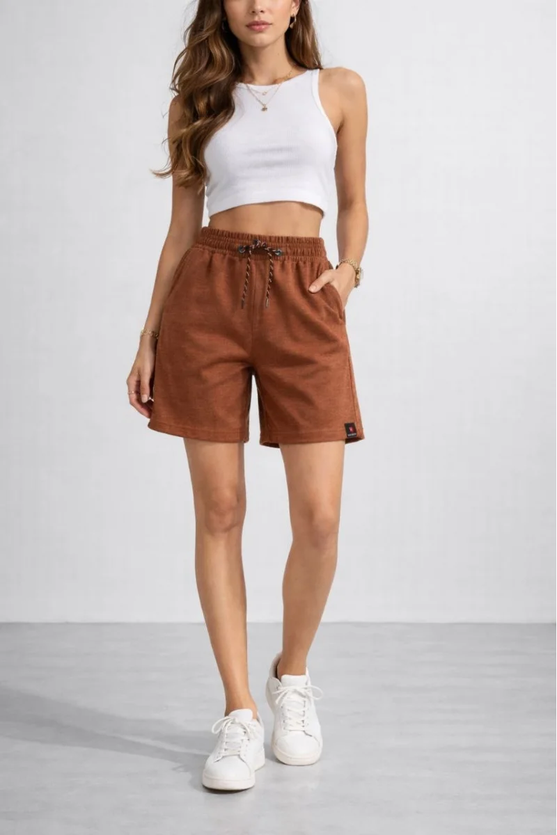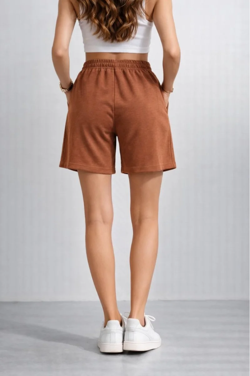 Kadın Dokuma otoban Şort Beli Lastikli Bağcıklı Cepli Kesim Şort - Kahverengi