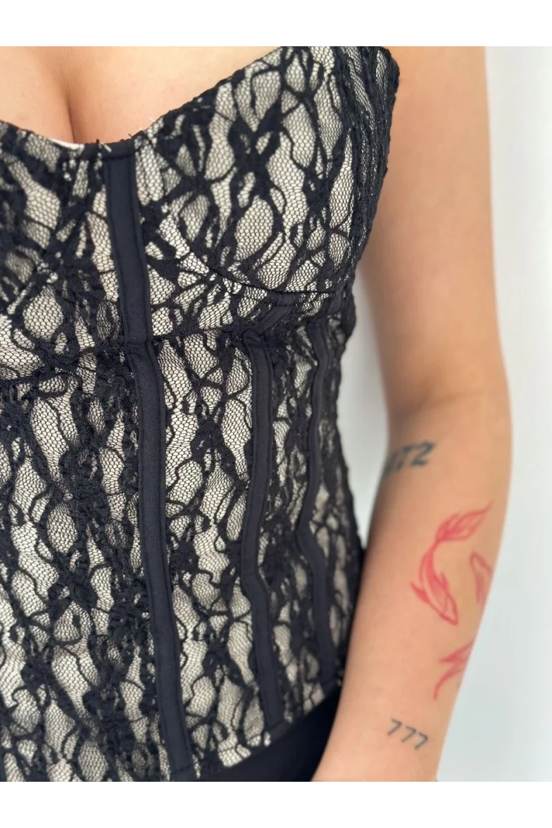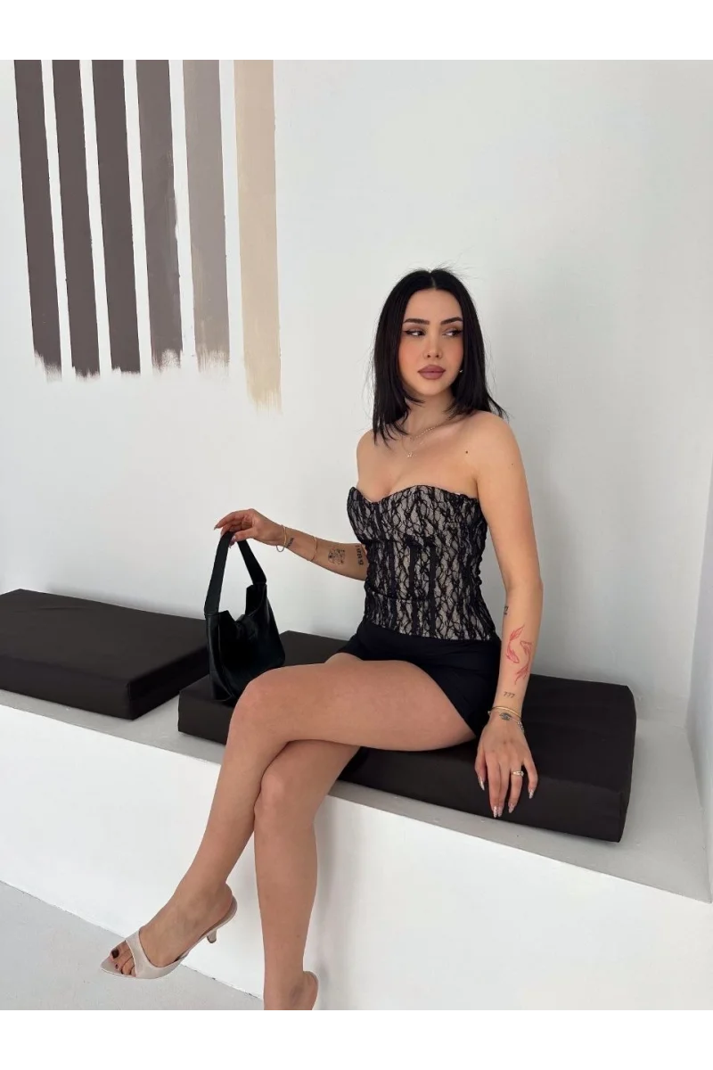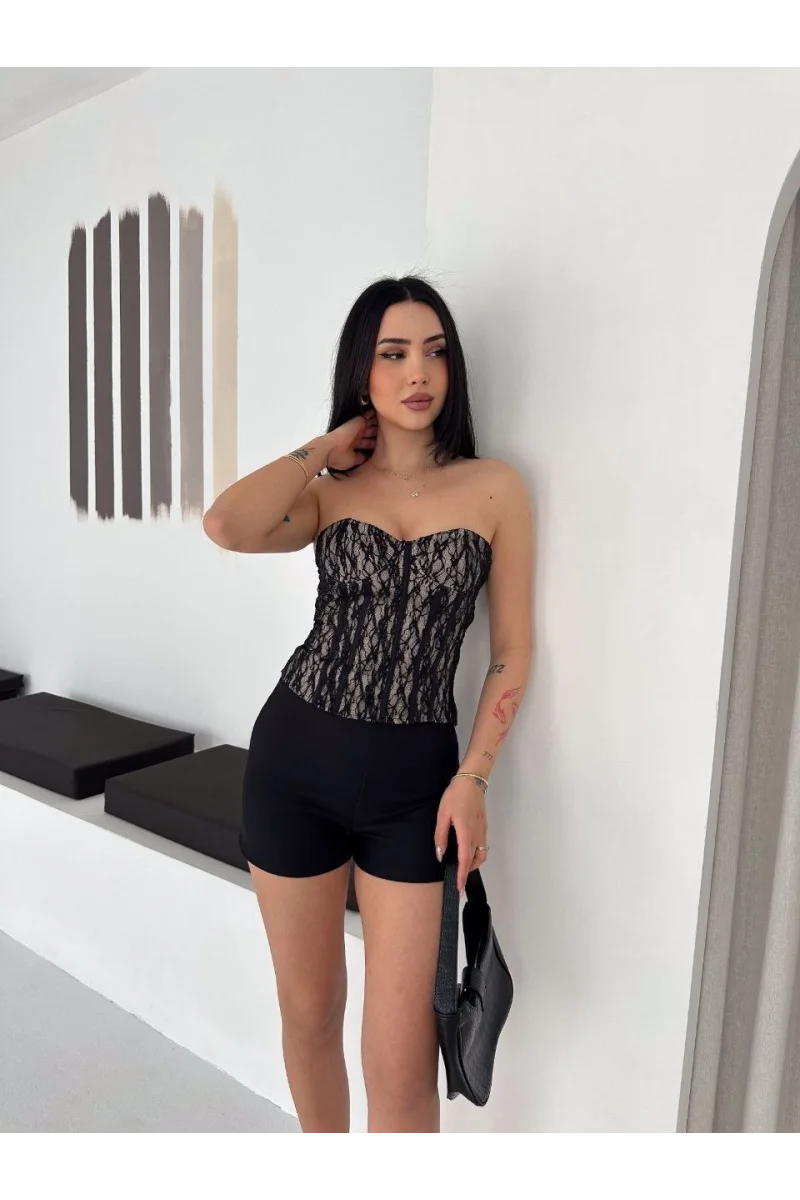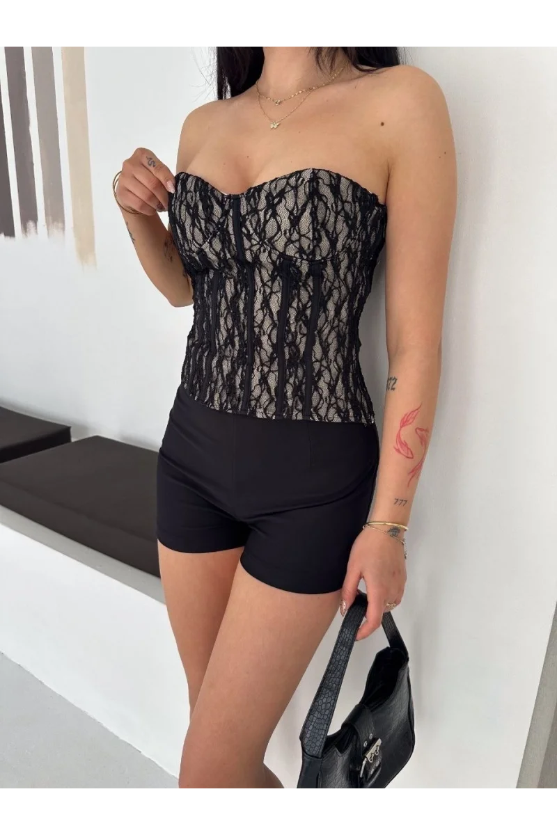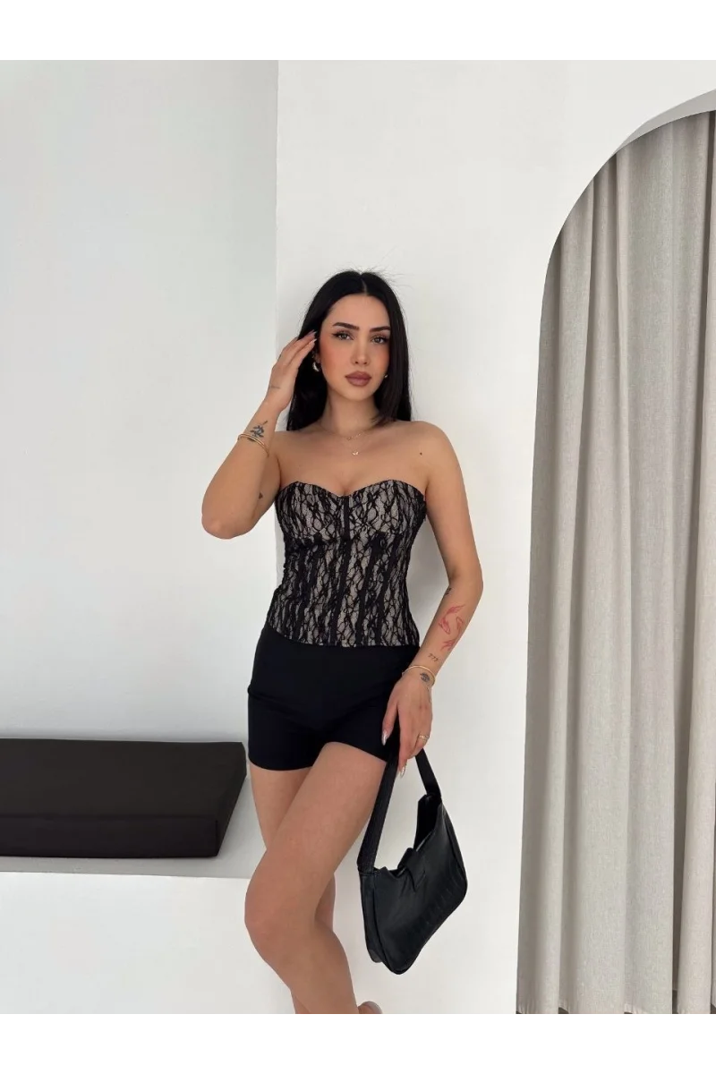Kadın Fermuarlı Dantel Korse Straplez Bustiyer Transparan Şık Top - Bej
