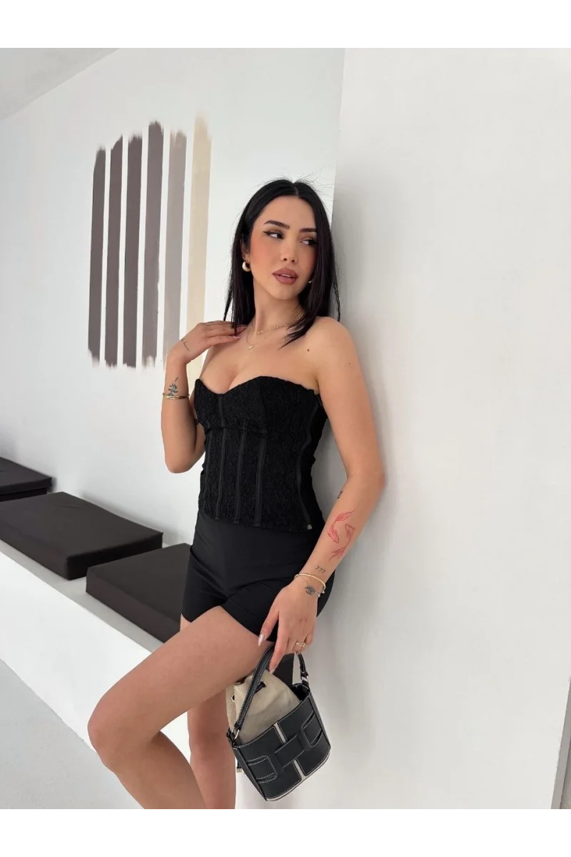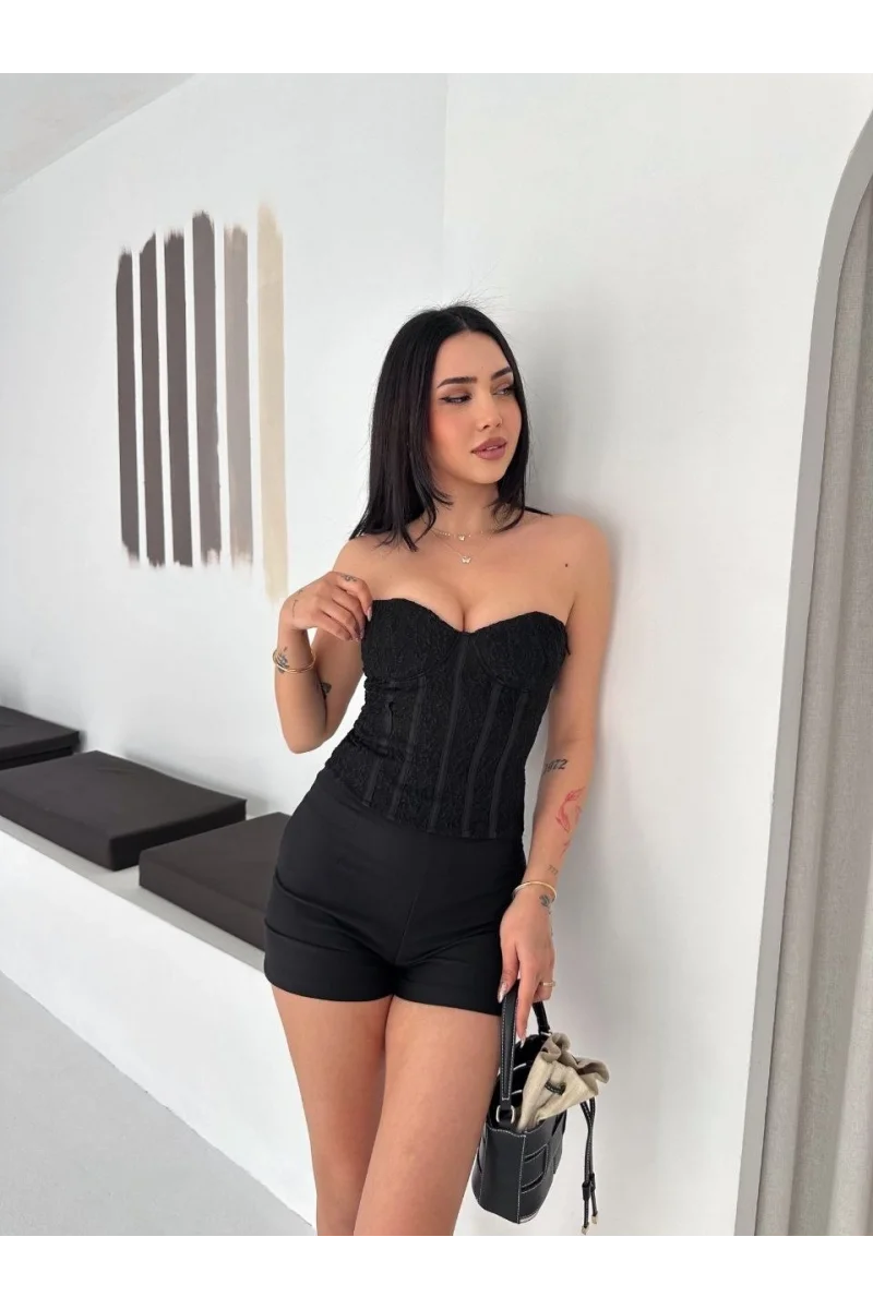 Kadın Fermuarlı Dantel Korse Straplez Bustiyer Transparan Şık Top - Siyah