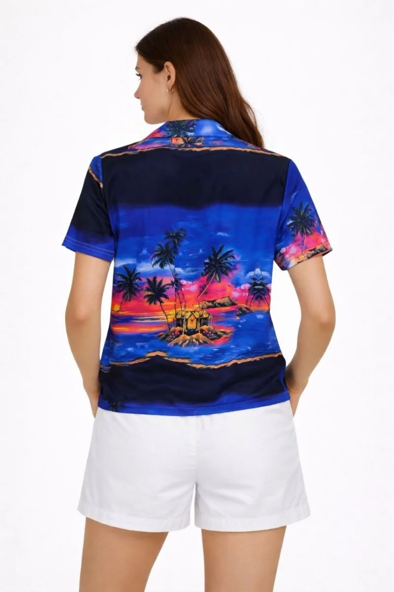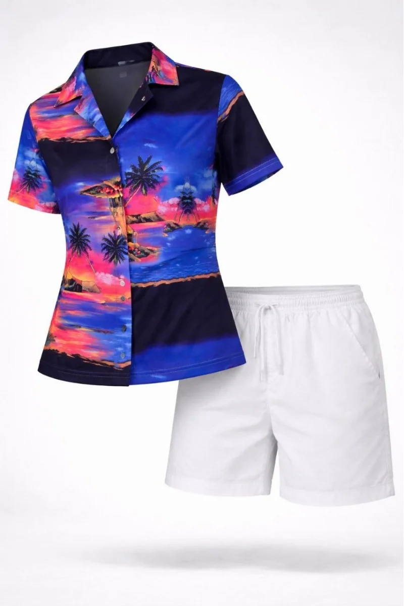 Kadın Gün Batımı Tropikal Desenli Kısa Kol Gömlek Şort Takım Yazlık Rahat Kalıp - Desenli