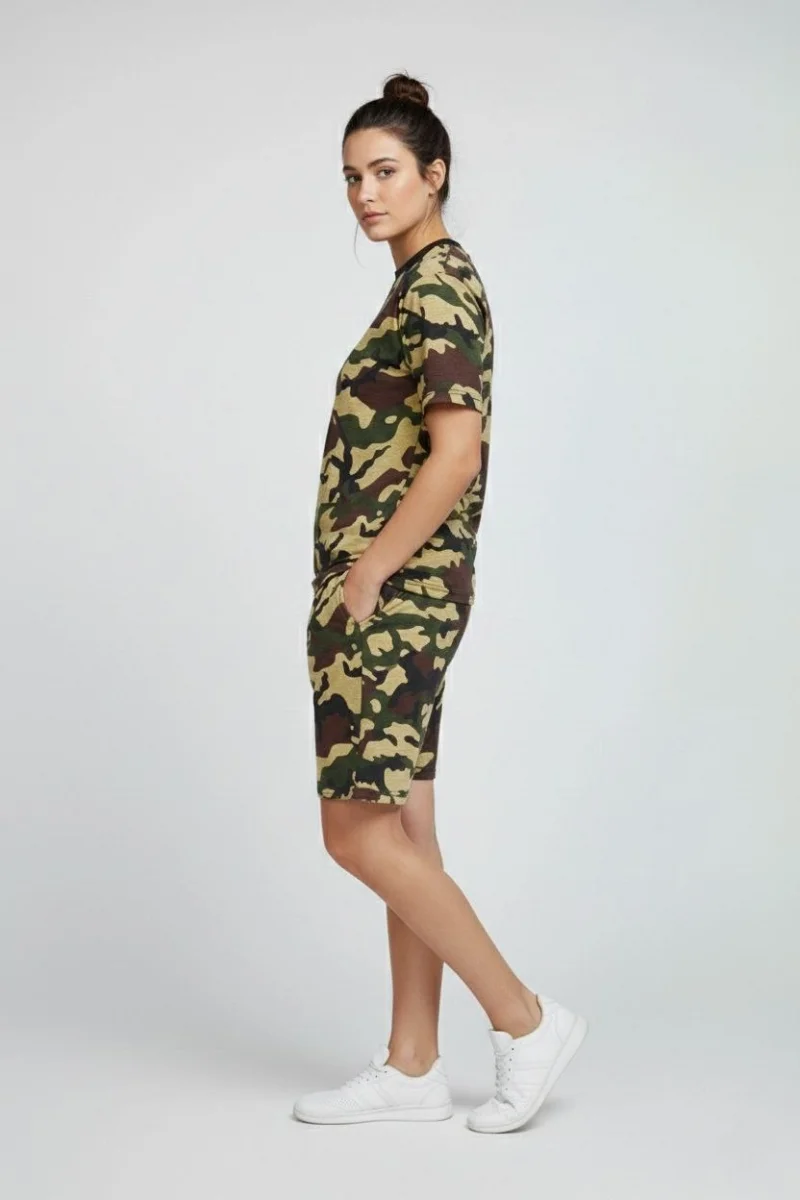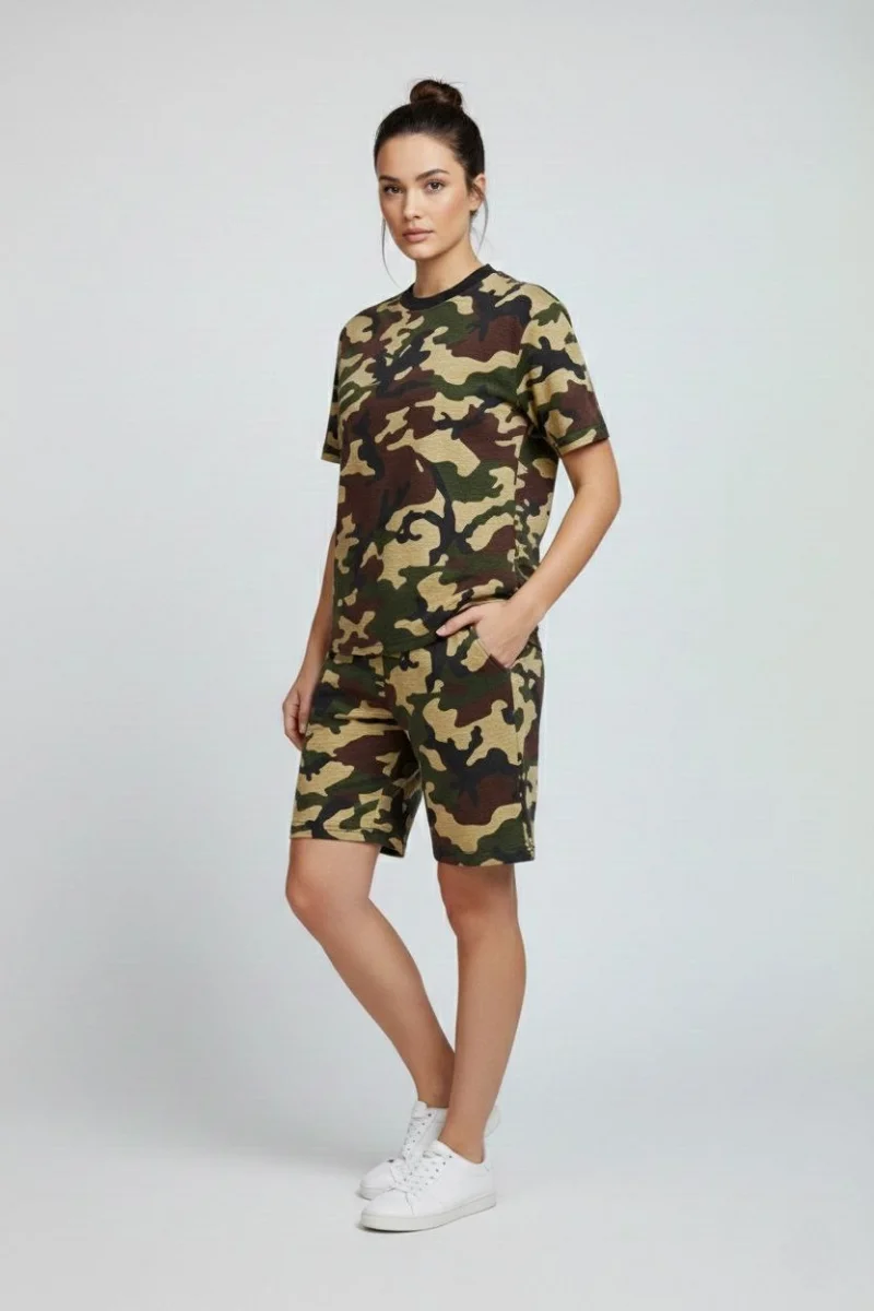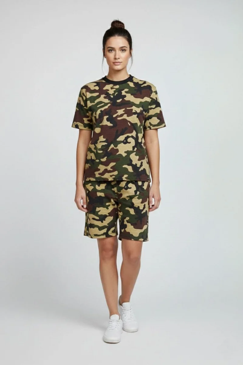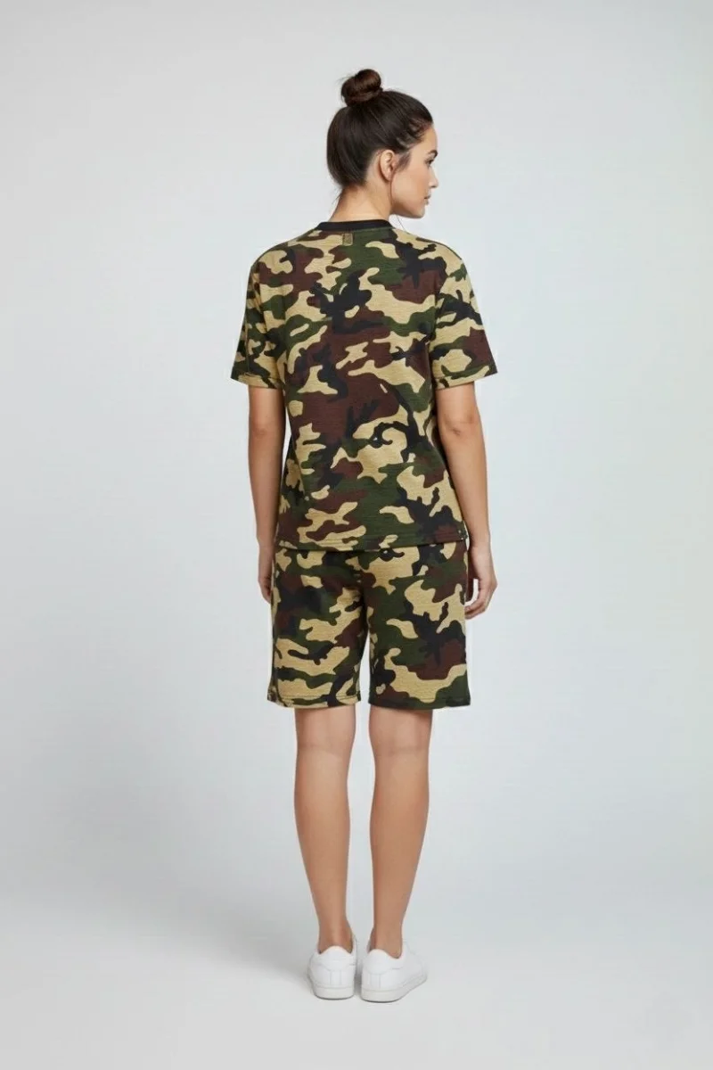 Kadın Kamuflaj Desenli Tişört Şort Takım Kesim 2’li - Kamuflaj