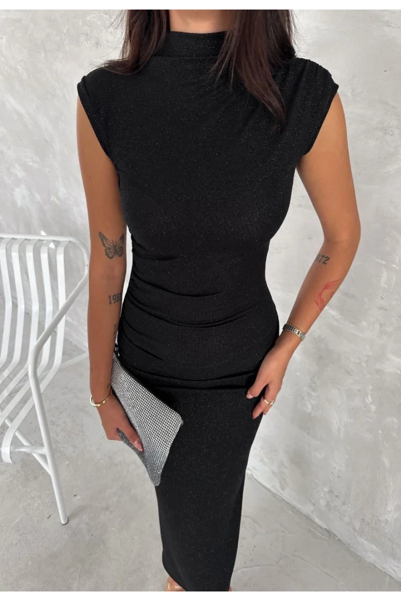 Kadın Likralı Simli Kumaş Yandan Yırtmaçlı Uzun Elbise Şık Kolsuz Abiye - Siyah