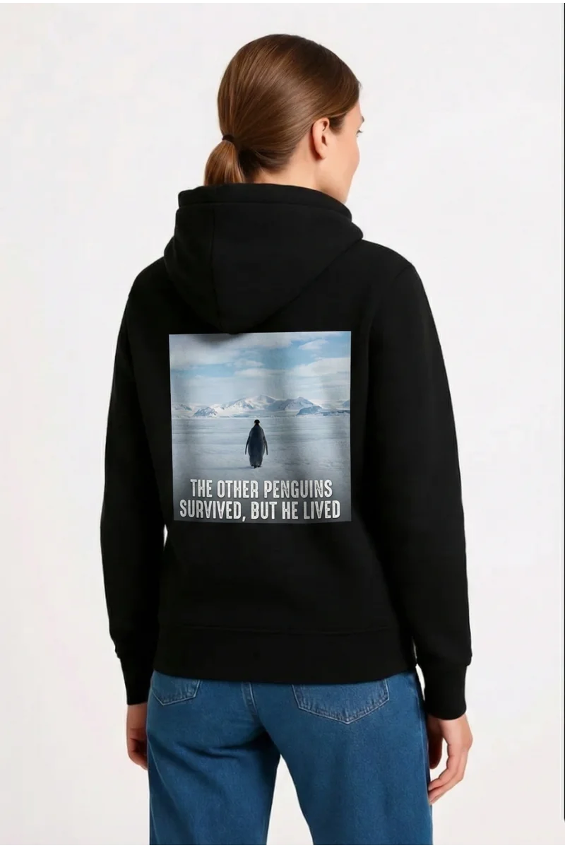 Kadın Oversize - Sırt Baskılı "Survivor Penguin" Temalı Felsefi Yazılı Kapüşonlu - Siyah