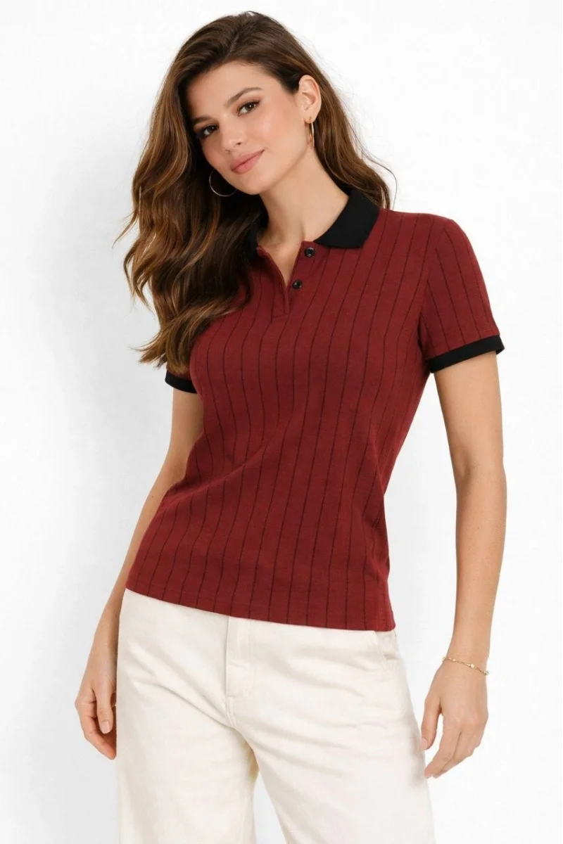 Kadın Polo Yaka Çizgili Tişört Kısa Kol Düğmeli Yazlık T-Shirt - Bordo