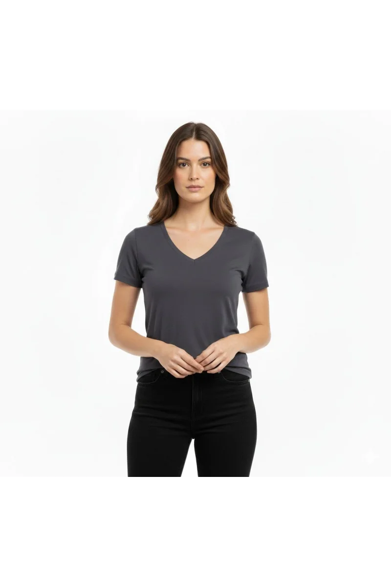 Kadın T-Shirt V Yaka Slim Fit Likralı Tişört Günlük Basic Body - Füme