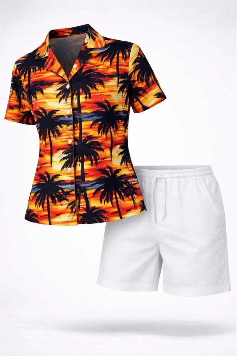 Kadın Tropikal Palmiye Desenli Gömlek Şort Takım Yazlık Rahat Kalıp - Desenli