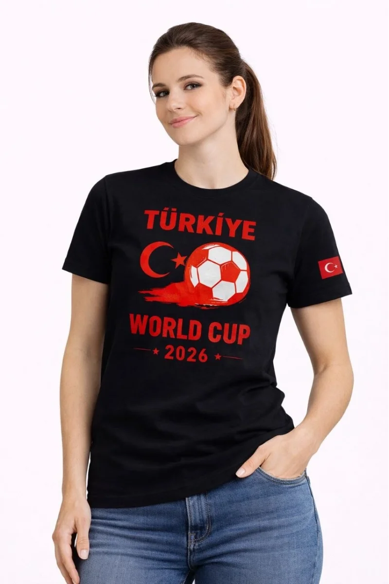 Kadın Türkiye World Cup 2026 Baskılı Tişört Futbol Temalı Forma T-Shirt - Siyah