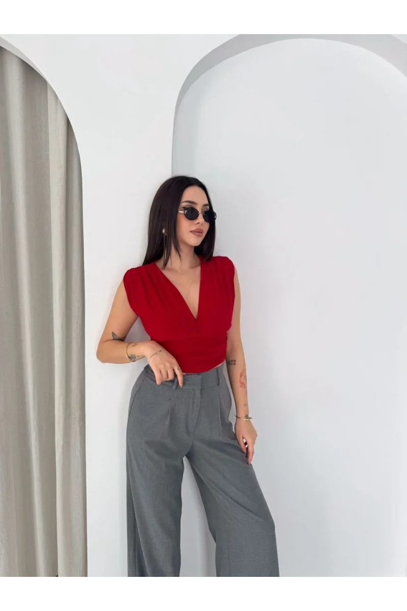 Kadın Vatkalı Kolsuz V Yaka Drapeli Crop Bluz Likralı Fit - Kırmızı