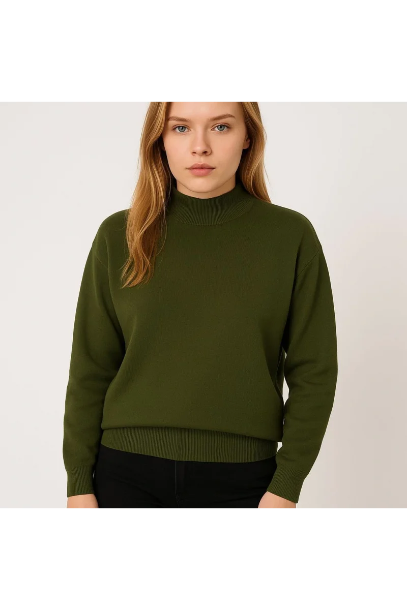 Kadın Yarım Boğaz Triko Kazak yumuşak dokulu Pamuklu ince Dokuma, uzun kollu Rahat Regular kalıp - Haki