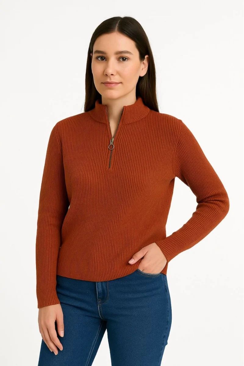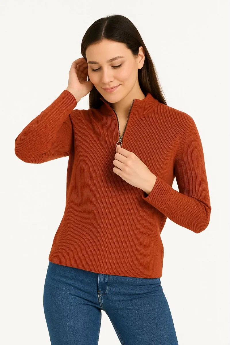 KADIN Yarım Fermuarlı Triko Kazak – Selanik Örgü, Dik Yaka, Pamuklu Dokuma, Oversize Uzun Kollu Kışlık Model - Kiremit