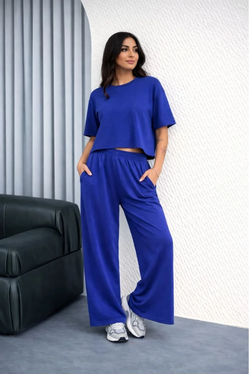 Kadın Osy Modal yumuşak dokulu Oversize İkili Takım Bol Paça Pantolonlu Takım - Saks Mavisi