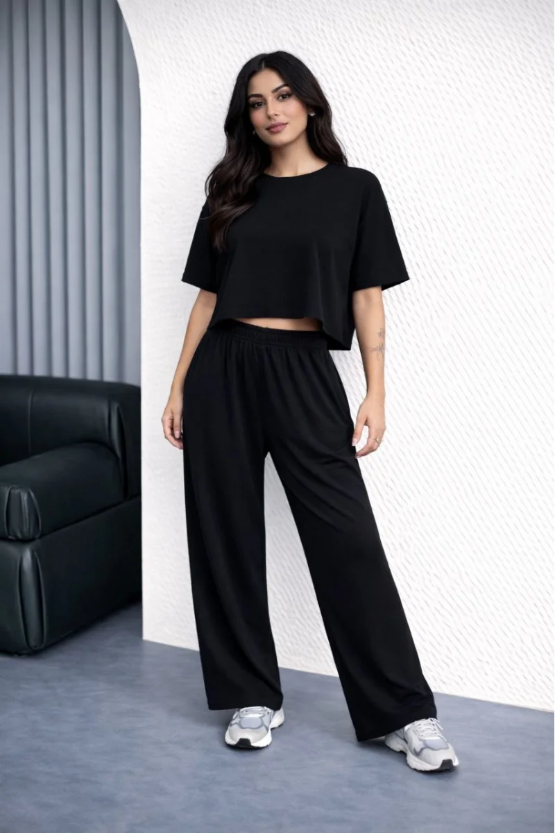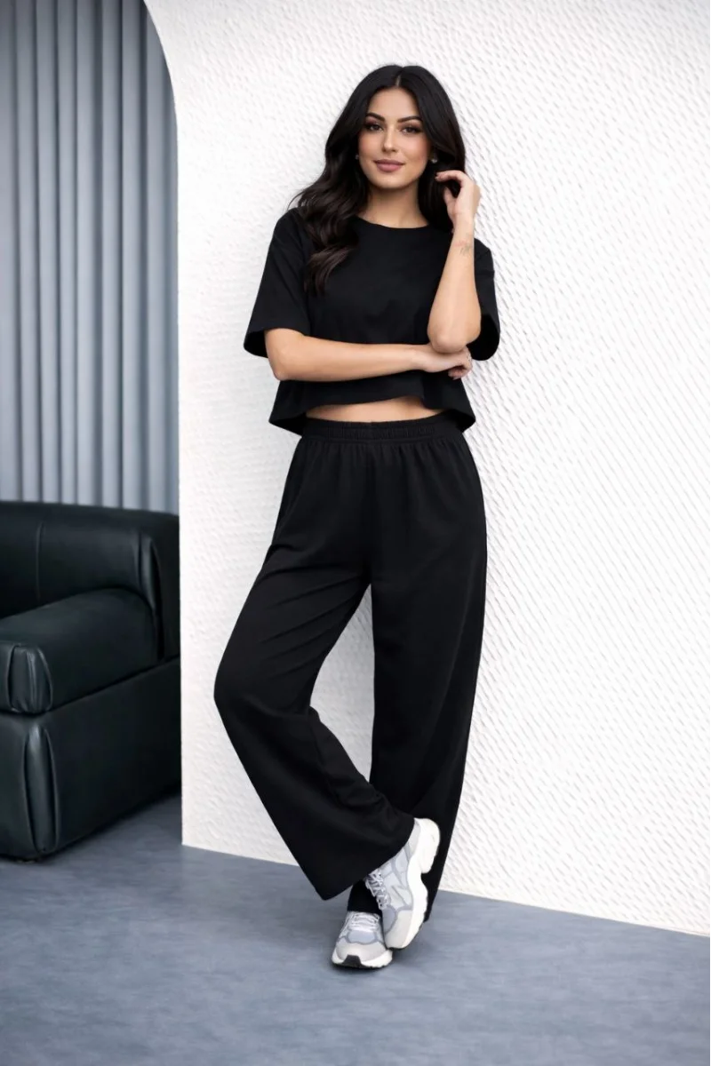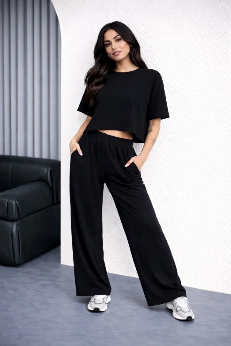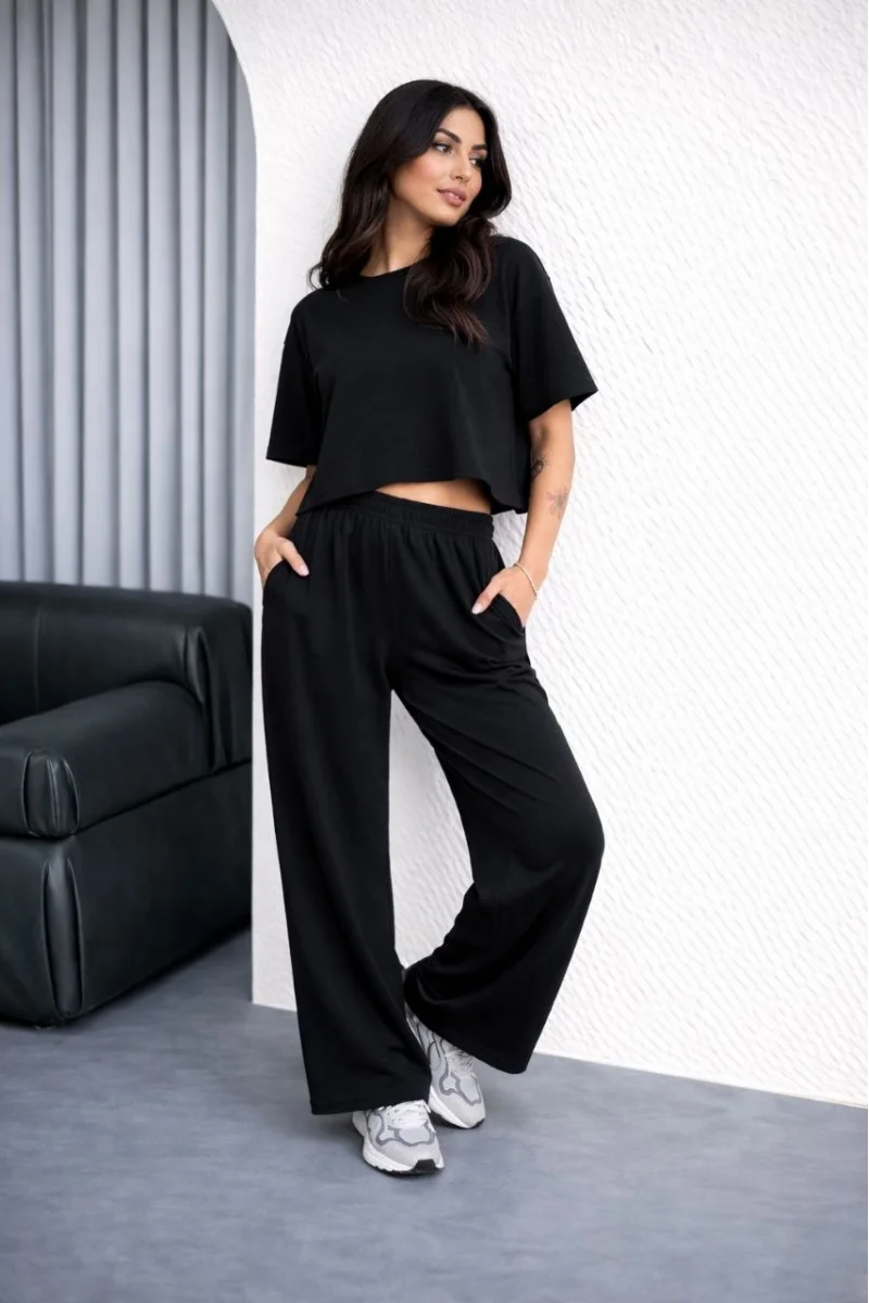 Kadın Osy Modal yumuşak dokulu Oversize İkili Takım Bol Paça Pantolonlu Takım - Siyah