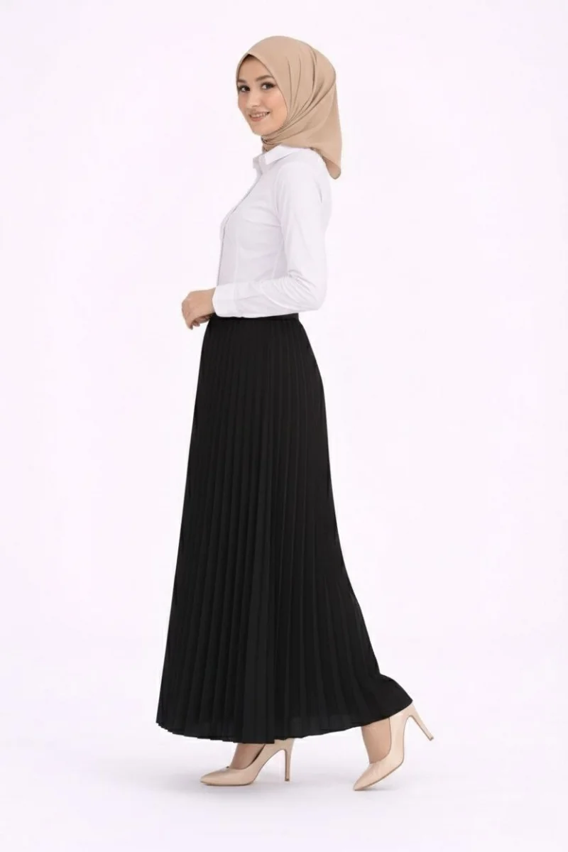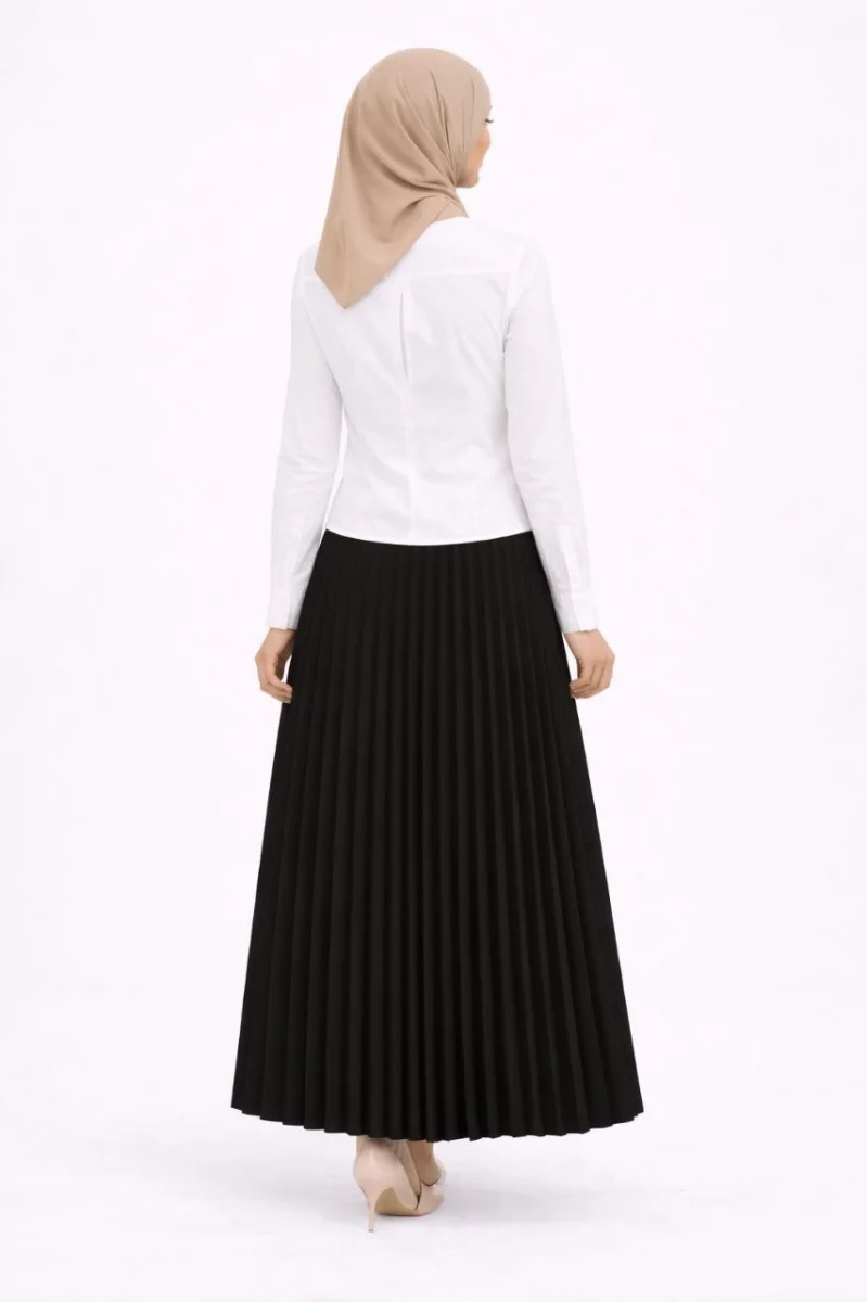 Tesettür Beyaz Gömlekli Pliseli Etek İkili Takım Gündelik ve Ofis Şıklığı - Siyah