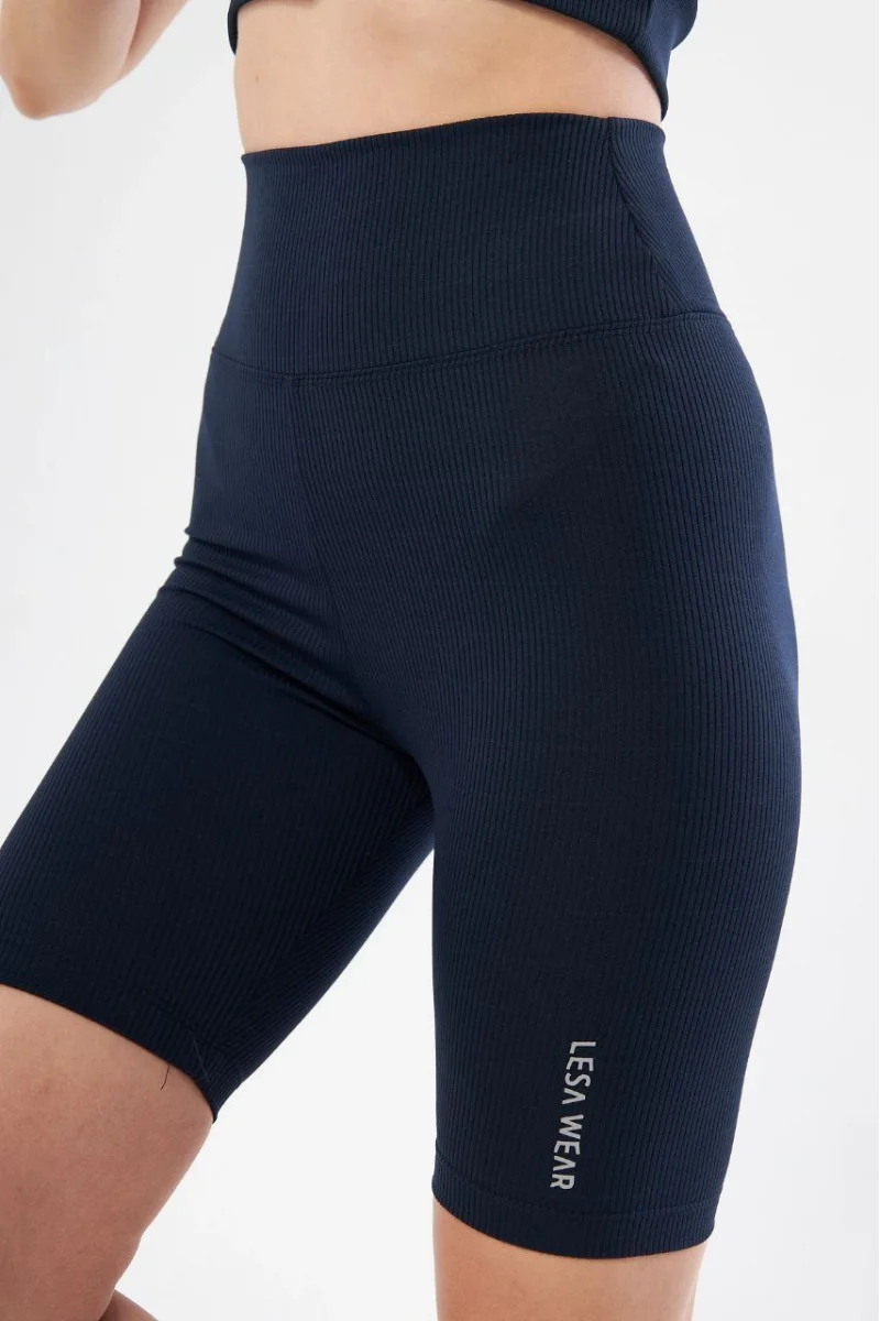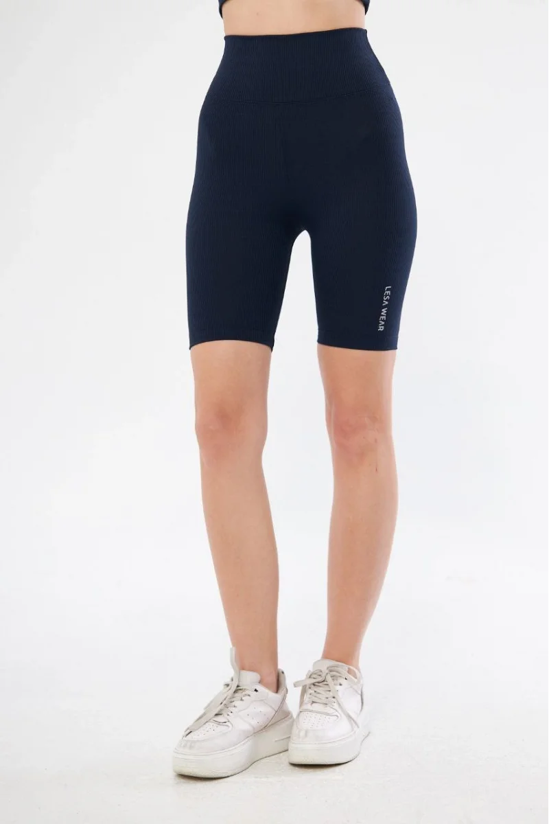 Yüksek Bel Fitilli Biker Baskılı Şort - Lacivert